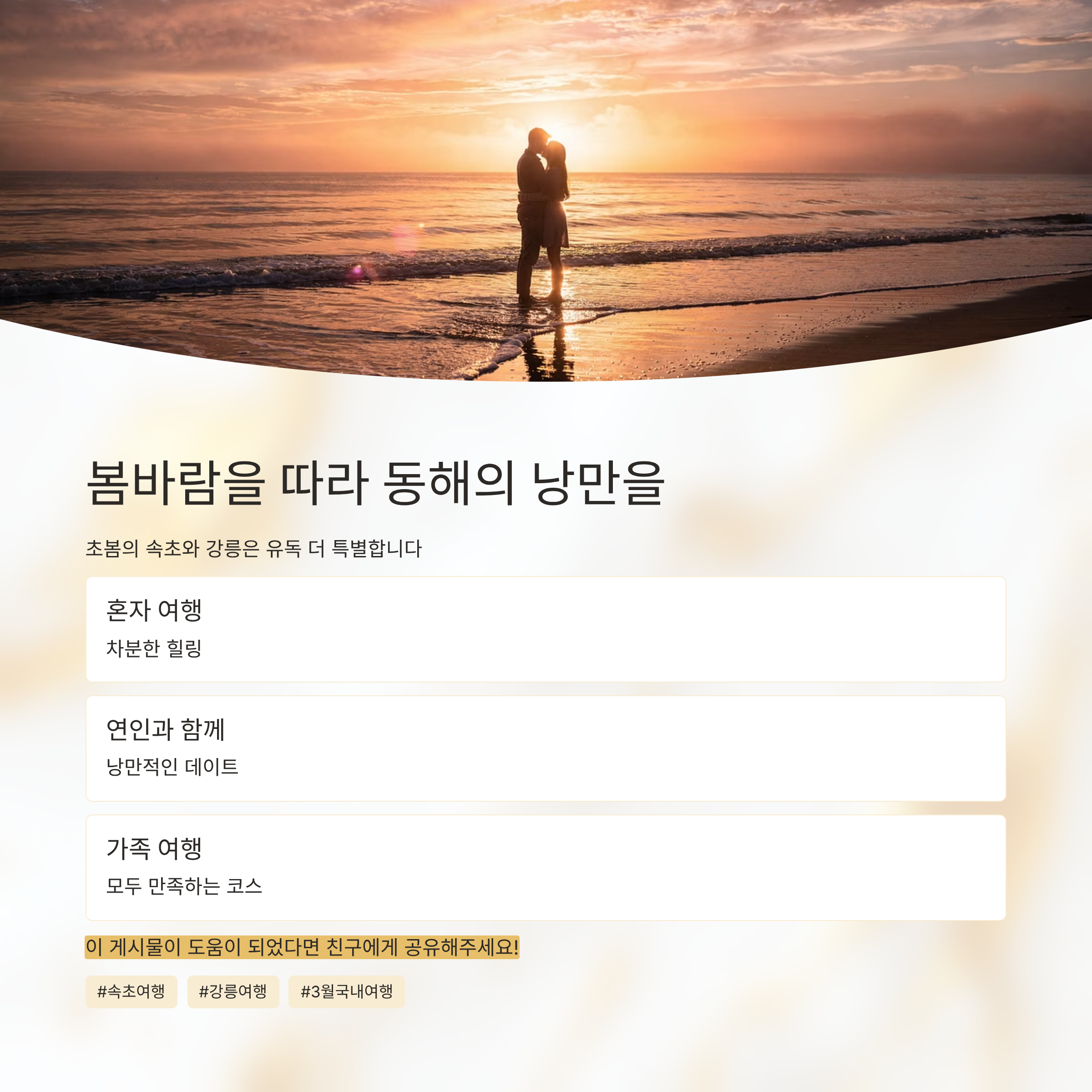 속초와 강릉은 계절을 막론하고 언제나 좋은 여행지지만, 초봄에는 유독 더 특별합니다. 차분하게 새해를 맞이하며 힐링하고 싶은 분들께 강력히 추천드려요. 혼자 떠나도, 연인과 함께여도, 가족여행으로도 모두 만족할 수 있는 코스들로 준비했습니다. 봄바람을 따라 동해의 낭만을 만나보세요.
