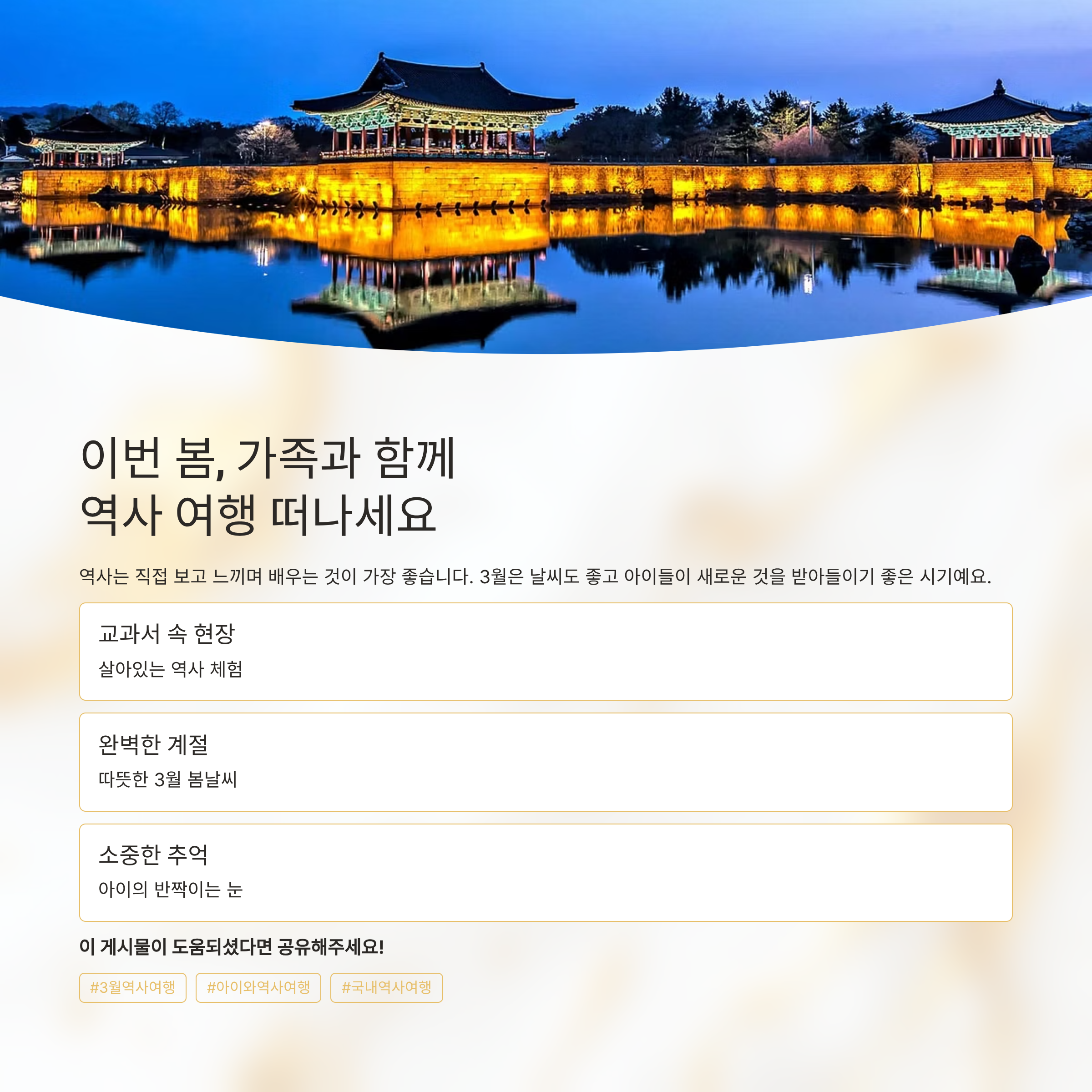 역사는 교과서로만 배우는 것이 아니라, 직접 보고 느끼며 배우는 것이 가장 좋습니다. 3월은 아이들이 새로운 것을 받아들이기 좋은 시기이자, 날씨도 여행하기에 부담 없는 계절이에요. 이번 봄에는 가족과 함께 역사 유적지를 찾아 떠나보세요. 아이의 눈이 반짝이는 순간을 마주하게 될 거예요.