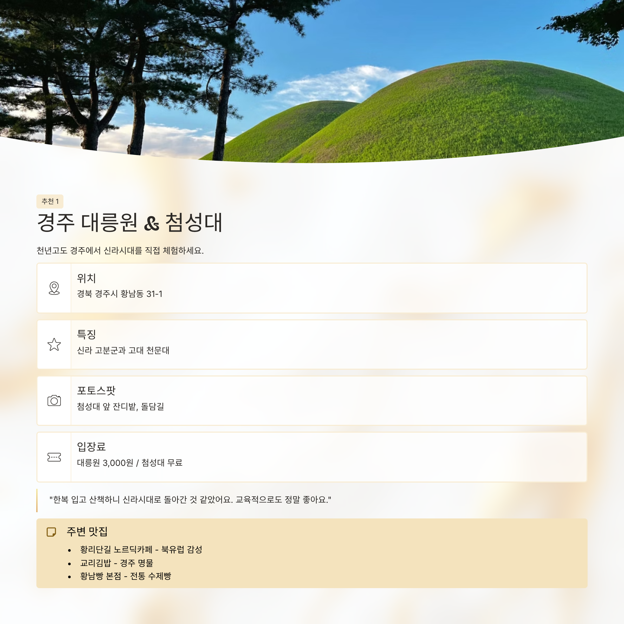 “아이와 함께 한복을 입고 산책하니 마치 신라 시대로 돌아간 것 같았어요. 설명도 잘 되어 있어 교육적으로도 좋아요.”경주 인근 맛집 및 카페