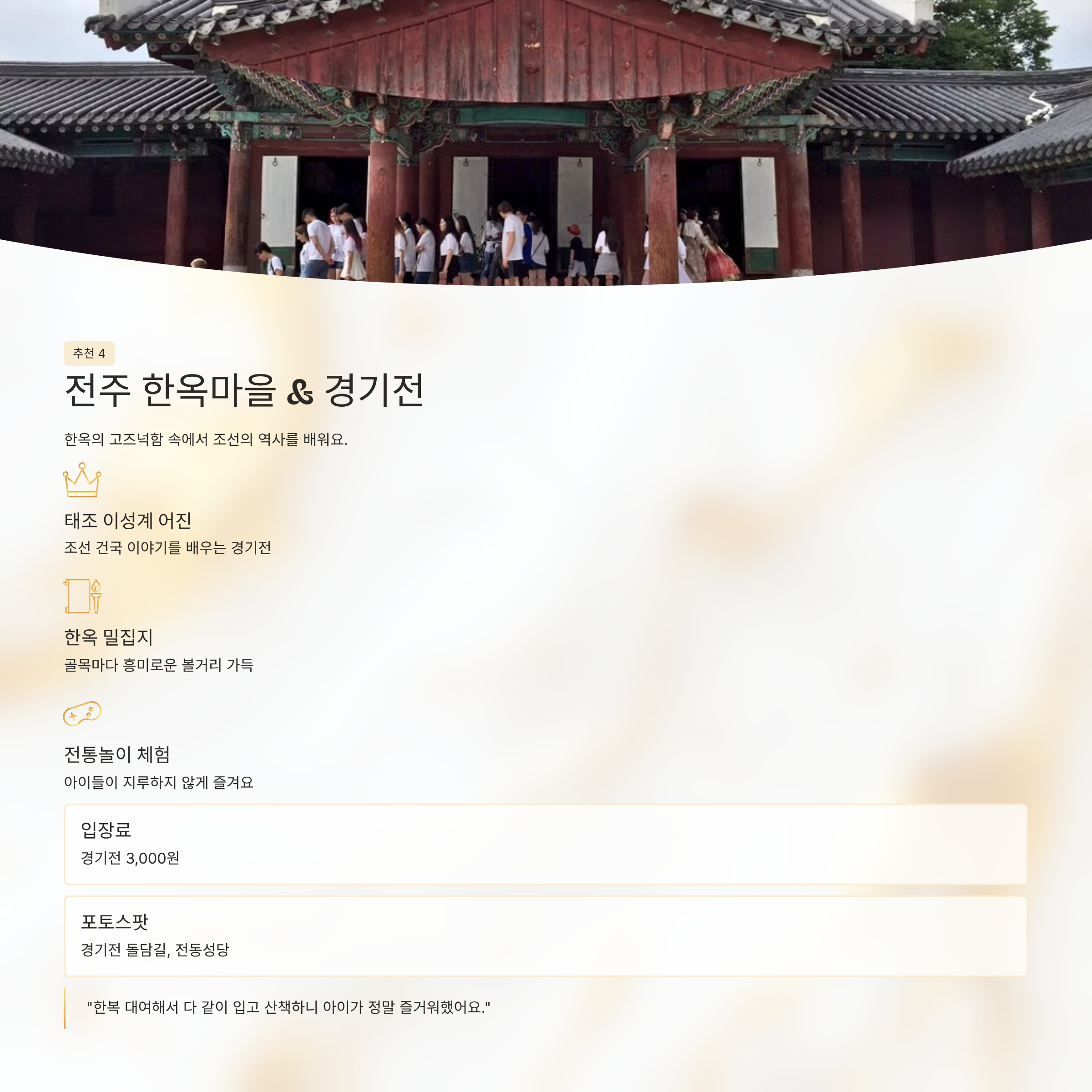 “한복 대여해서 다 같이 입고 산책하니 아이가 정말 즐거워했어요. 경기전 설명도 쉽게 되어 있어서 이해하기 좋았어요.”전주 인근 맛집 및 카페
