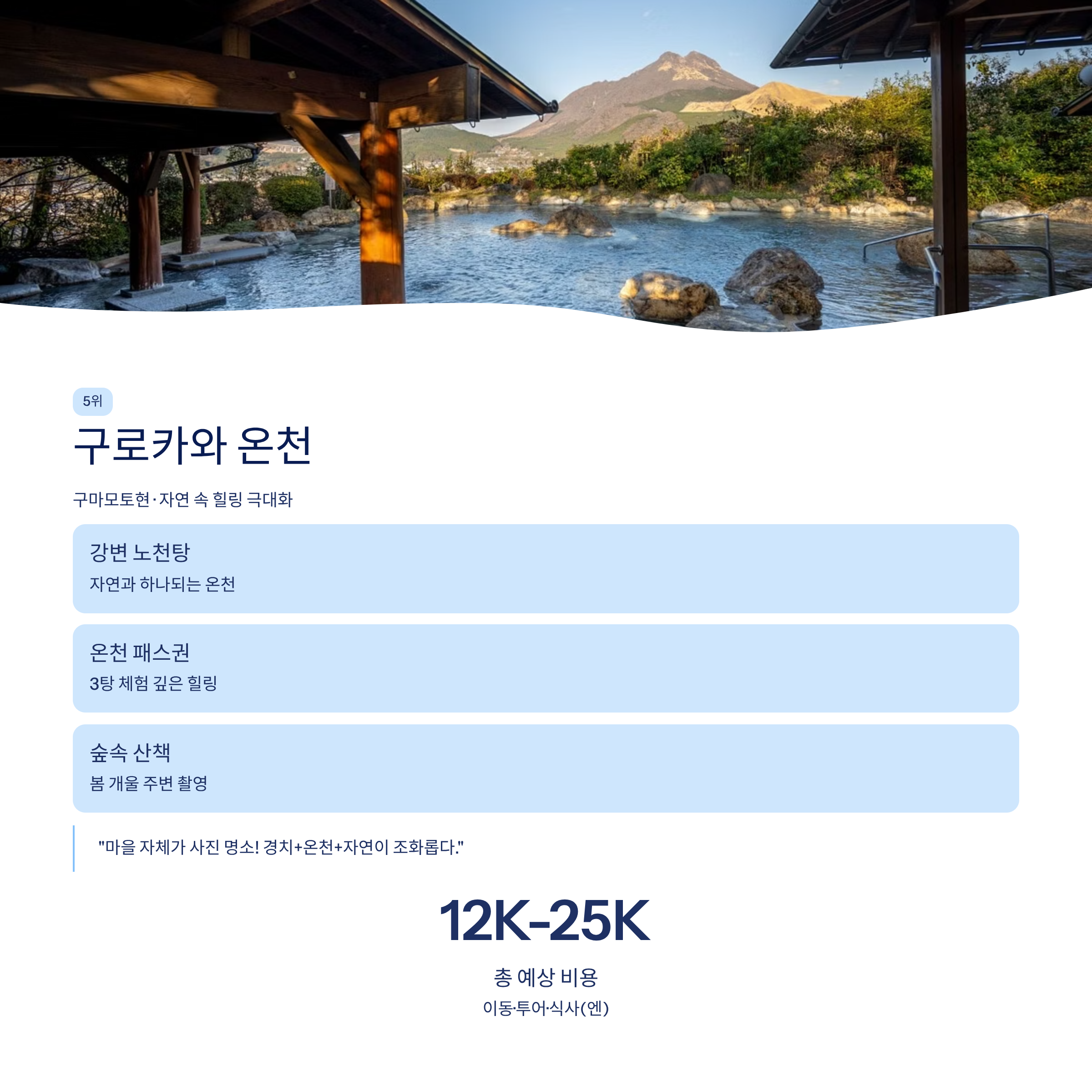 - 봄에는 벚꽃·신록과 함께 산책형 온천 여행 구성 가능