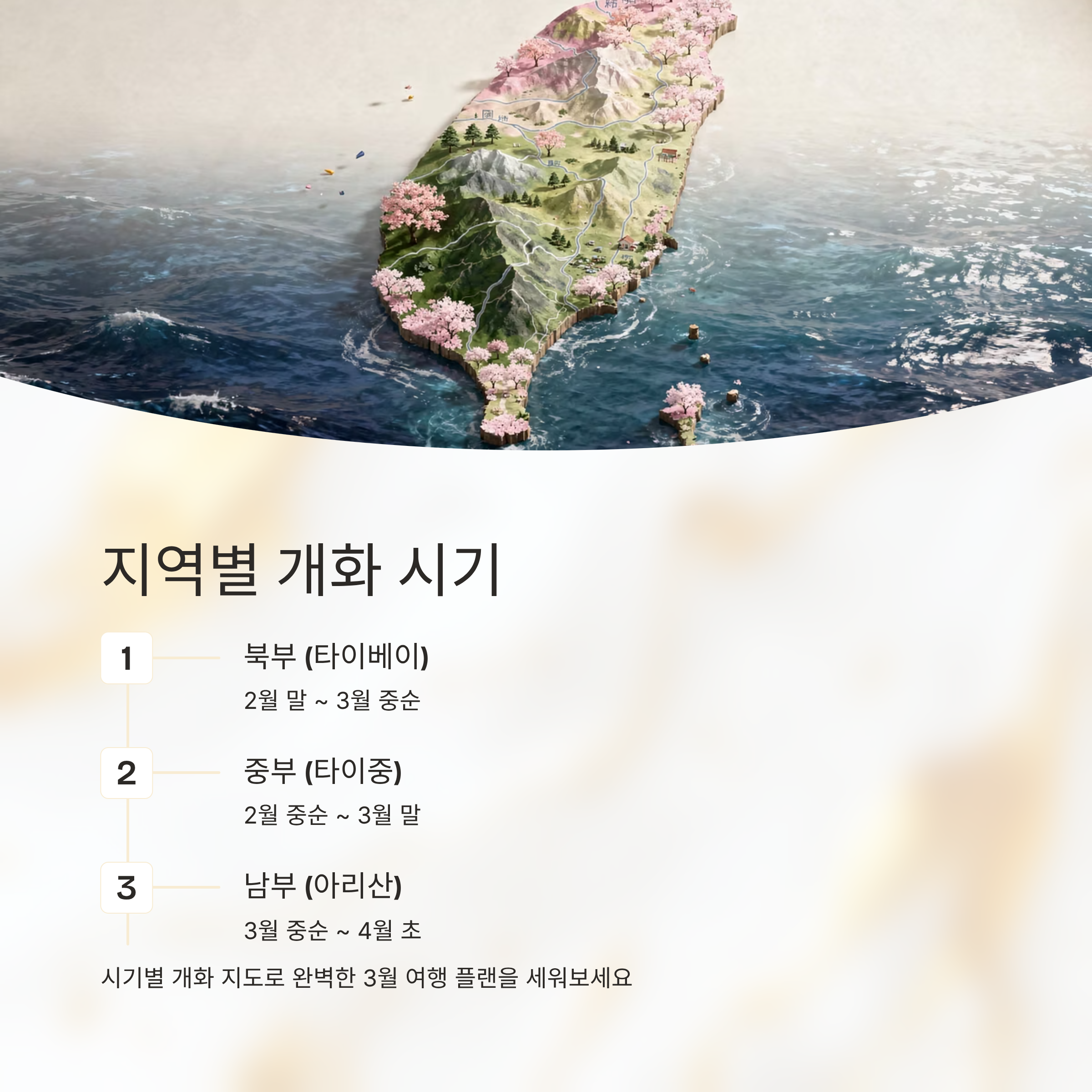 북부(타이베이 등) 2월 말 ~ 3월 중순 중부(타이중 등) 2월 중순 ~ 3월 말 남부(아리산 등) 3월 중순 ~ 4월 초 이 시기별 개화 지도를 기준으로 3월 여행 플랜을 짜면 대만 벚꽃을 가장 아름답게 즐길 수 있습니다.