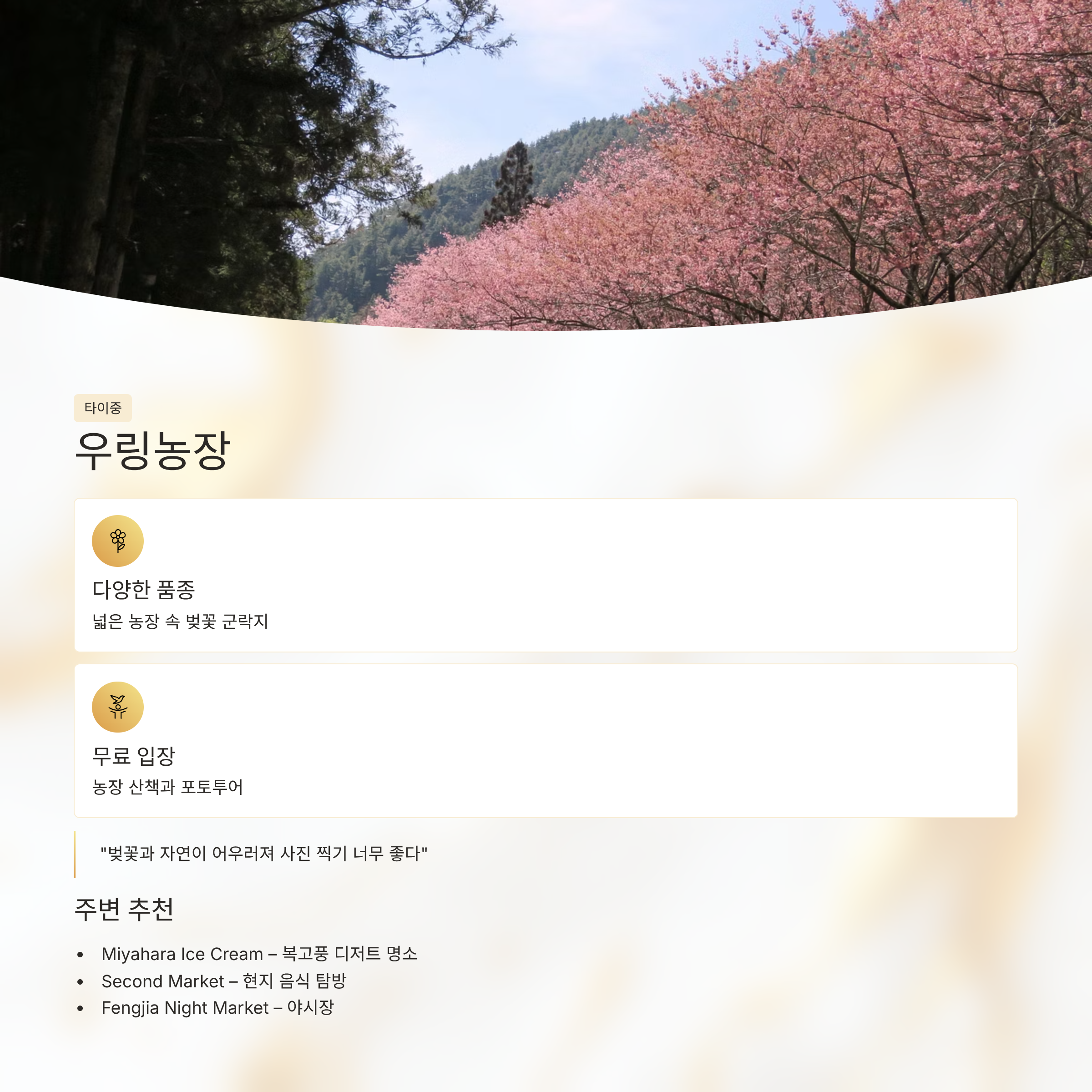 🌸 특징: 대만 최고 인기 벚꽃 명소 중 하나로 왕벚꽃, 산벚꽃 여러 품종 감상 가능