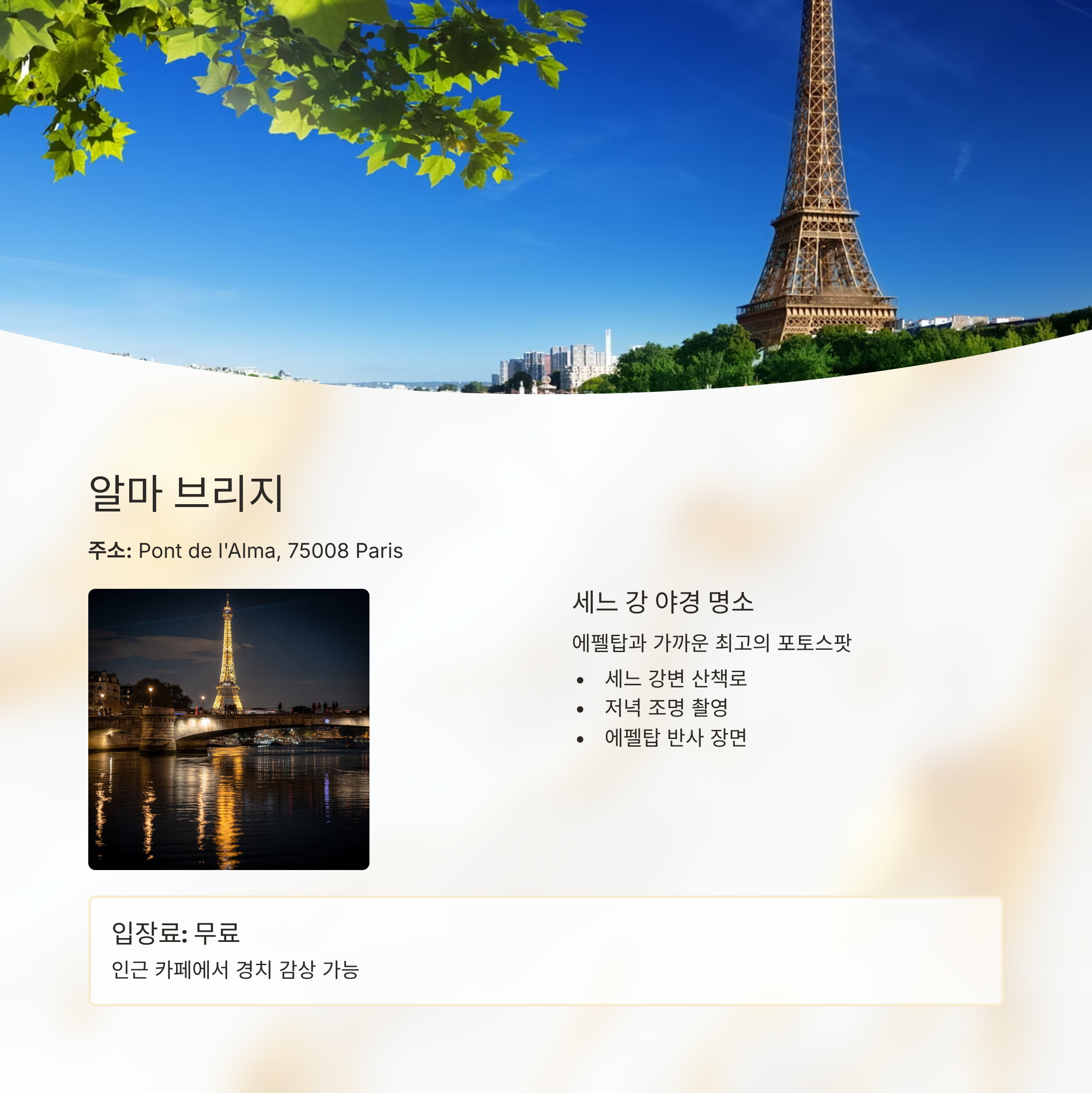 알마 브리지는 파리의 세느 강을 가로지르는 다리로, 에펠탑과 가까운 거리에 위치해 있어 최고의 포토스팟 중 하나로 손꼽힙니다. 이곳은 특히 저녁 시간대에 멋진 조명이 비추어져 아름다운 야경을 즐기기에 이상적인 장소입니다. 벚꽃이 만개하는 봄철, 다리와 세느 강을 배경으로 한 사진이 매력적입니다.
