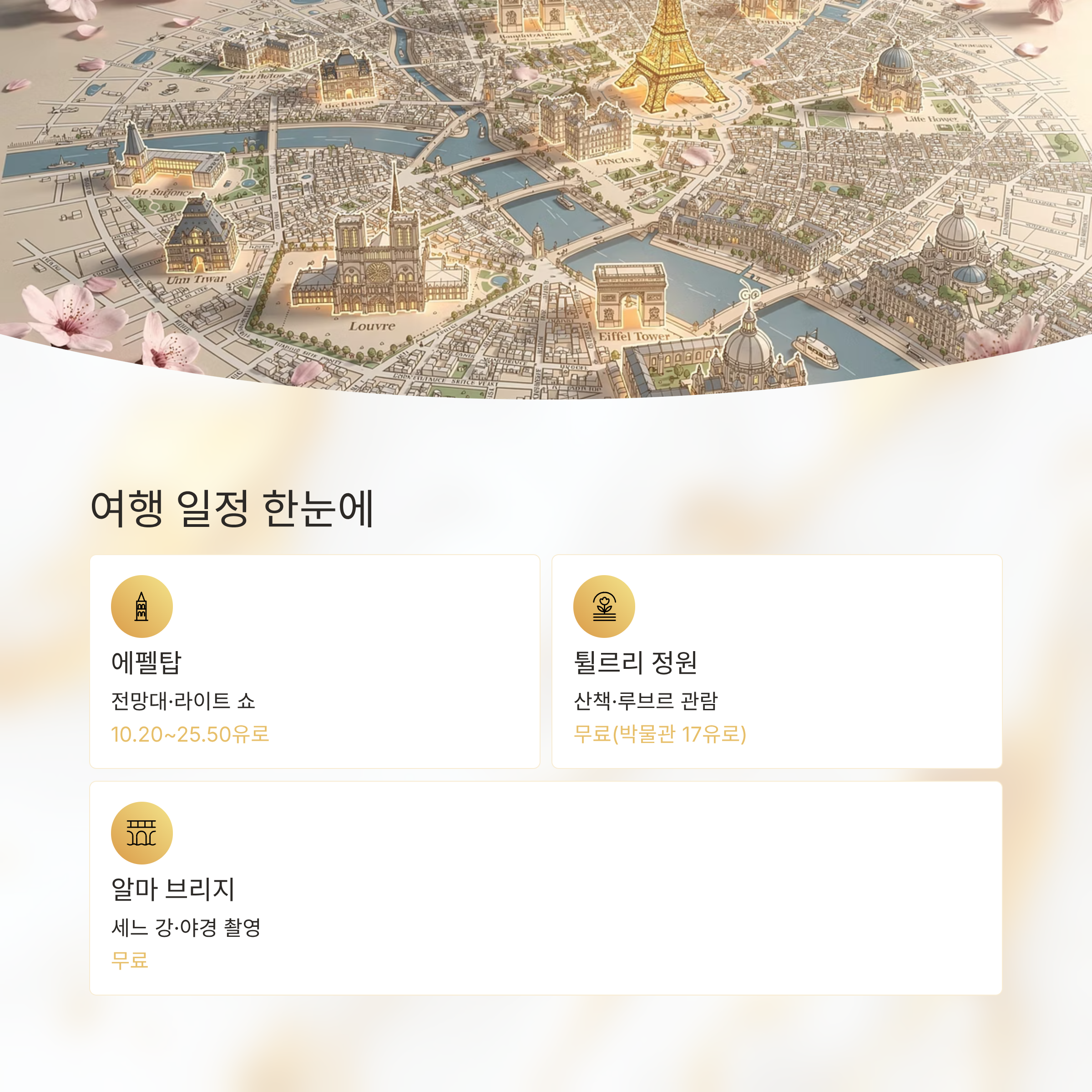 "에펠탑에 올라서 보는 파리의 전경은 정말 압도적이었습니다. 특히 저녁에 불빛이 켜지면서, 마치 꿈 속에 있는 것 같은 느낌을 받았어요. 봄에 벚꽃과 함께 담긴 에펠탑은 정말 로맨틱했습니다."