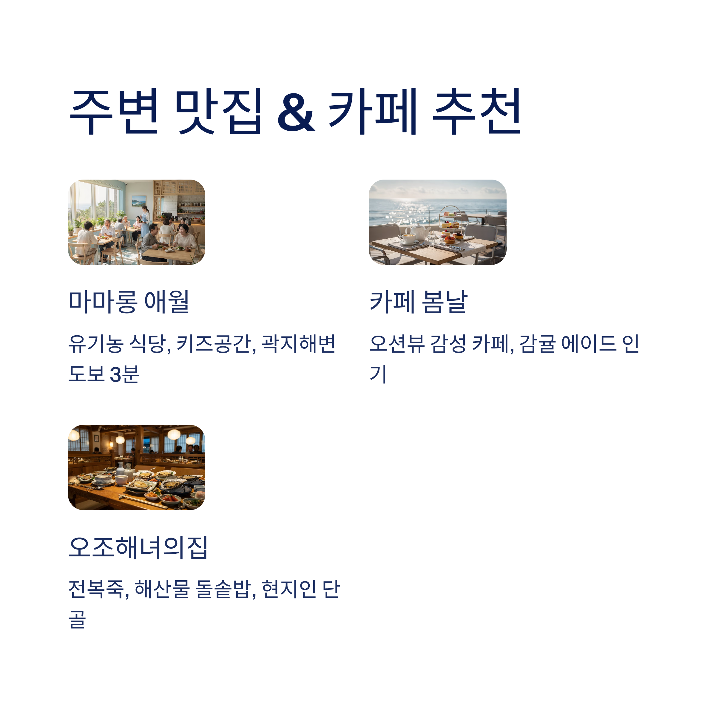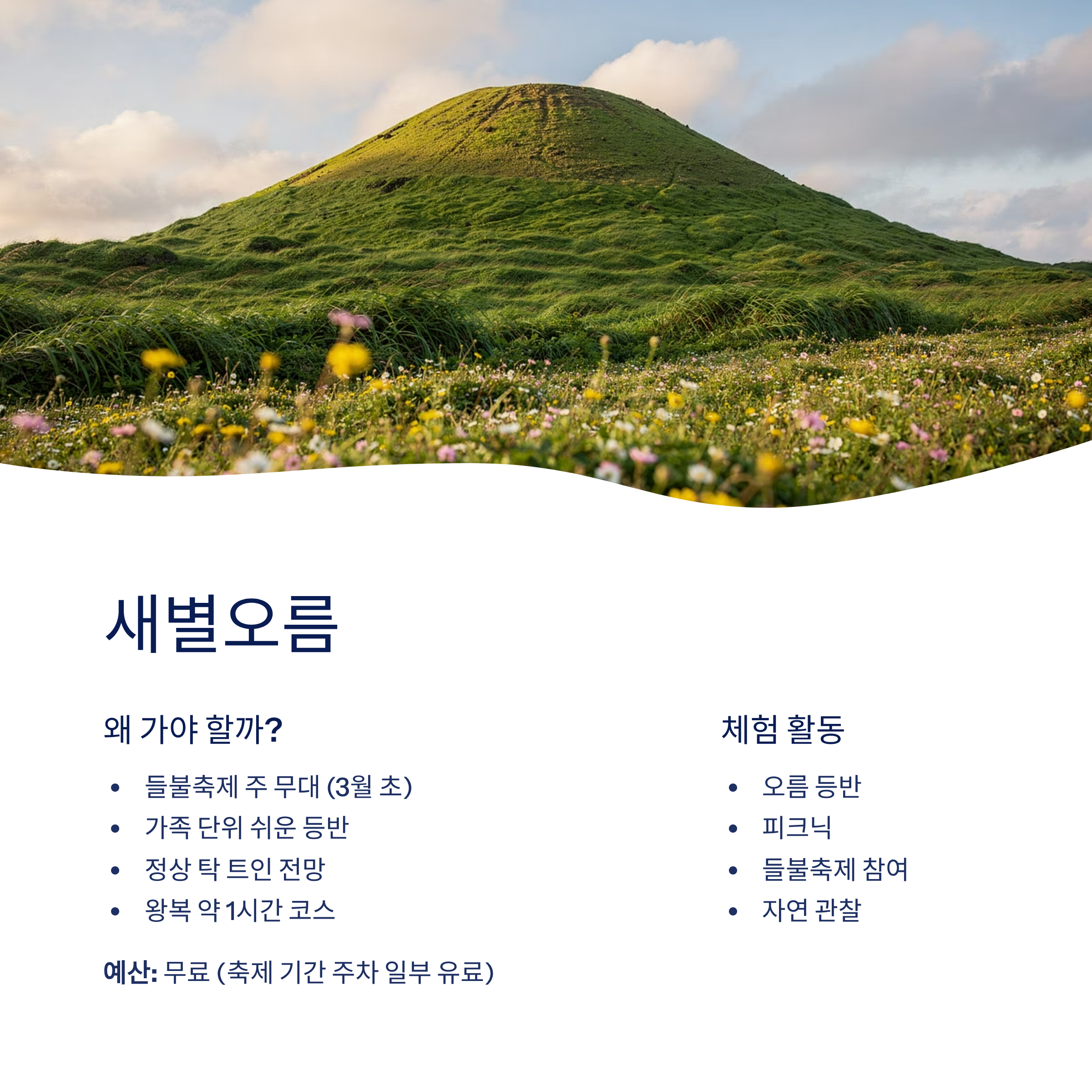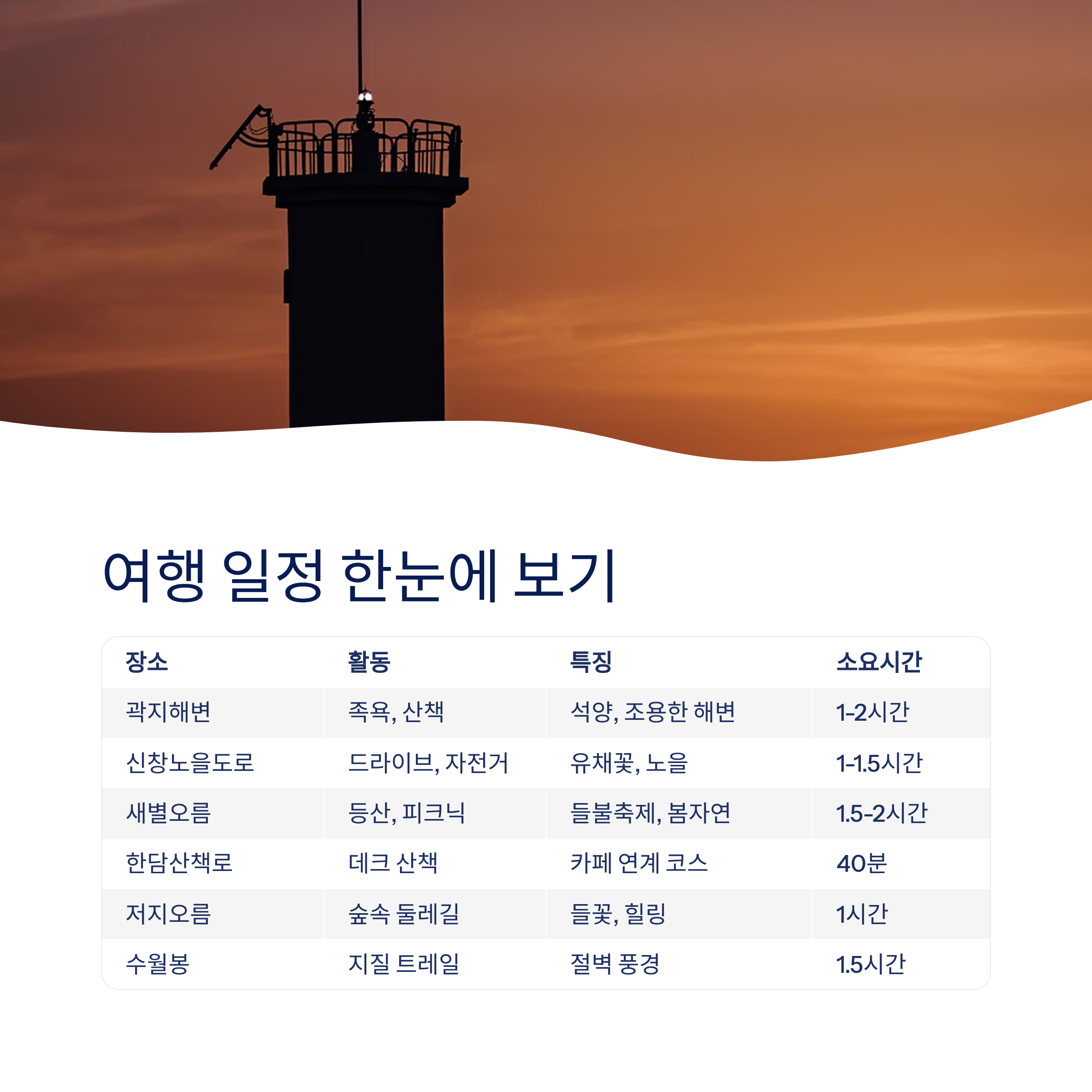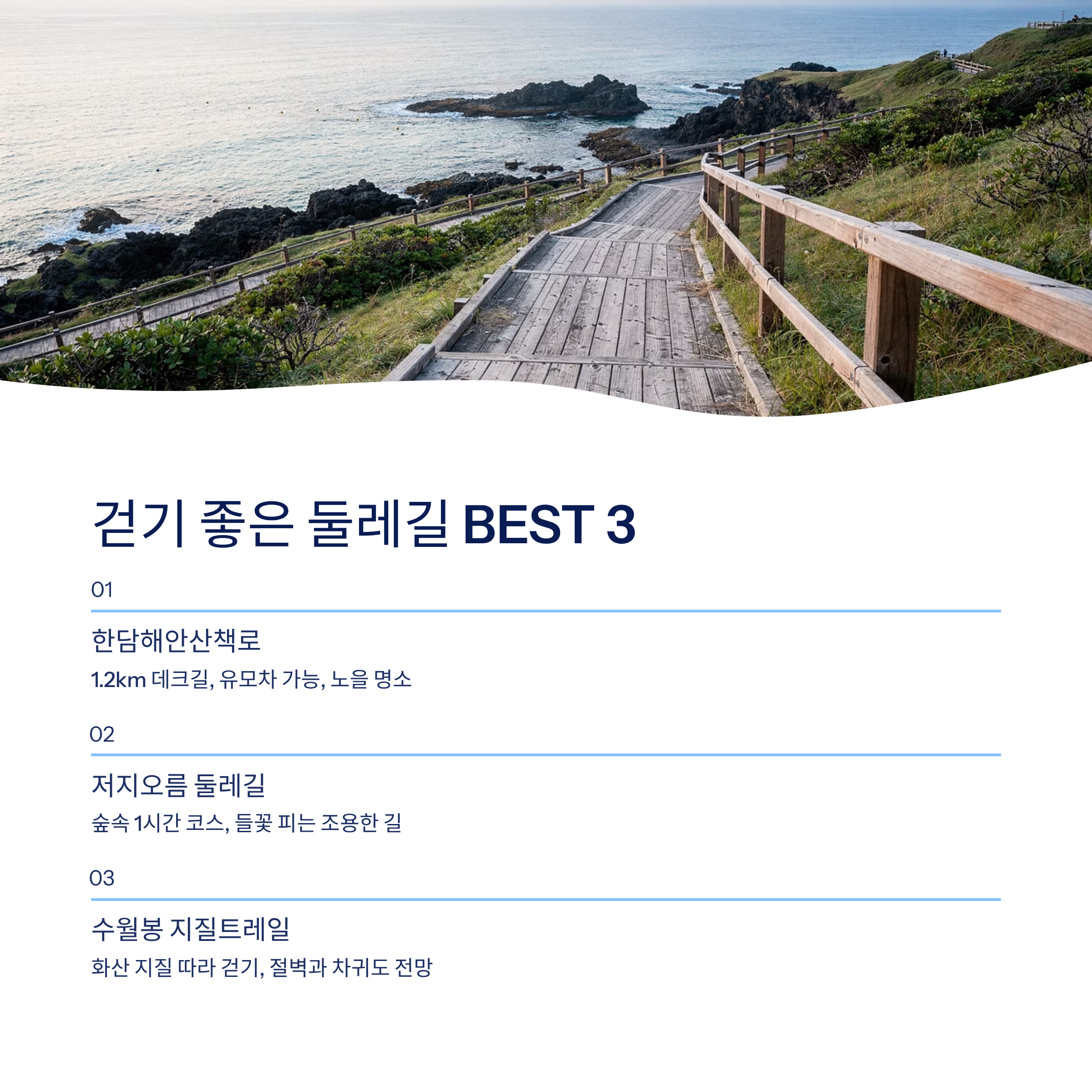 곽지해변 족욕, 산책, 모래놀이 석양, 조용한 해변 1~2시간 신창노을도로 드라이브, 자전거, 풍차 해풍, 유채꽃, 노을 명소 1~1.5시간 새별오름 오름 등산, 피크닉, 축제 들불축제, 봄자연 감상 1.5~2시간 한담산책로 데크 산책 카페 연계 쉬운 걷기 코스 40분 저지오름둘레길 숲속 둘레길 산책 들꽃, 조용한 숲속 힐링 1시간 수월봉트레일 지질 트레일, 풍경 감상 절벽 풍경, 차귀도 전망대 1.5시간