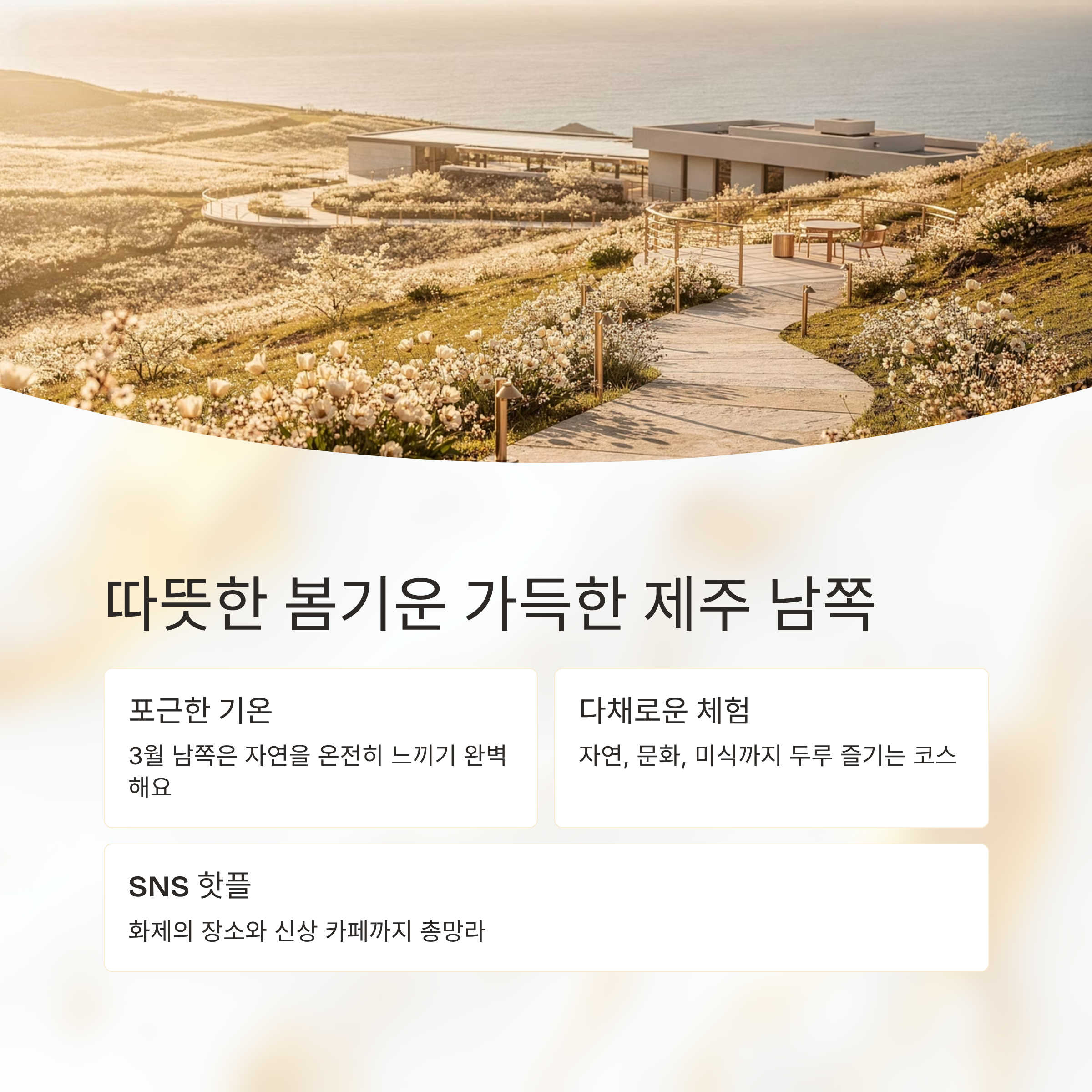 3월, 찬바람은 물러가고 따뜻한 햇살이 내려앉는 제주. 특히 남쪽 지역은 초봄에도 포근한 기온 덕분에 자연을 온전히 느끼며 여유로운 여행을 즐길 수 있어요. 서귀포 일대를 중심으로 한 이 루트는 걷기 좋은 둘레길과 함께 자연, 문화, 미식까지 두루 체험할 수 있는 코스로 구성되어 있습니다. SNS에서 화제인 장소와 신상 카페, 아이와 함께 체험 가능한 콘텐츠까지 모두 확인해보세요!