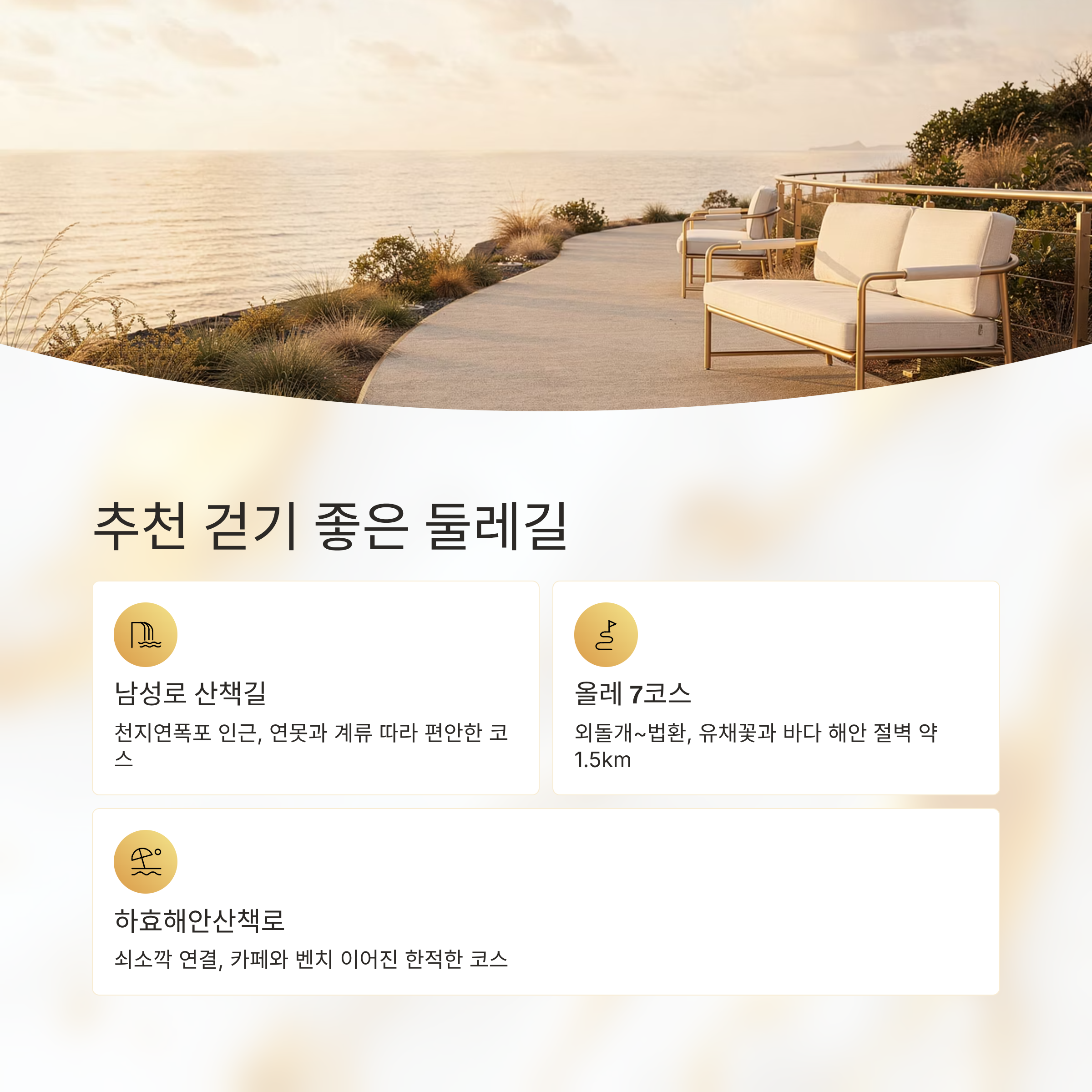 천지연폭포 폭포 감상, 산책 물줄기, 생태적 풍경 약 1시간 외돌개 해안절벽 관람, 걷기 유채꽃, 설화 스팟 약 1.5시간 쇠소깍 카약, 산책 민물+해양 체험, 숲길 약 2시간 남성로길 둘레길 산책 연못과 나무길 30~40분 하효해안길 해변 산책 조용한 지역명소 1시간