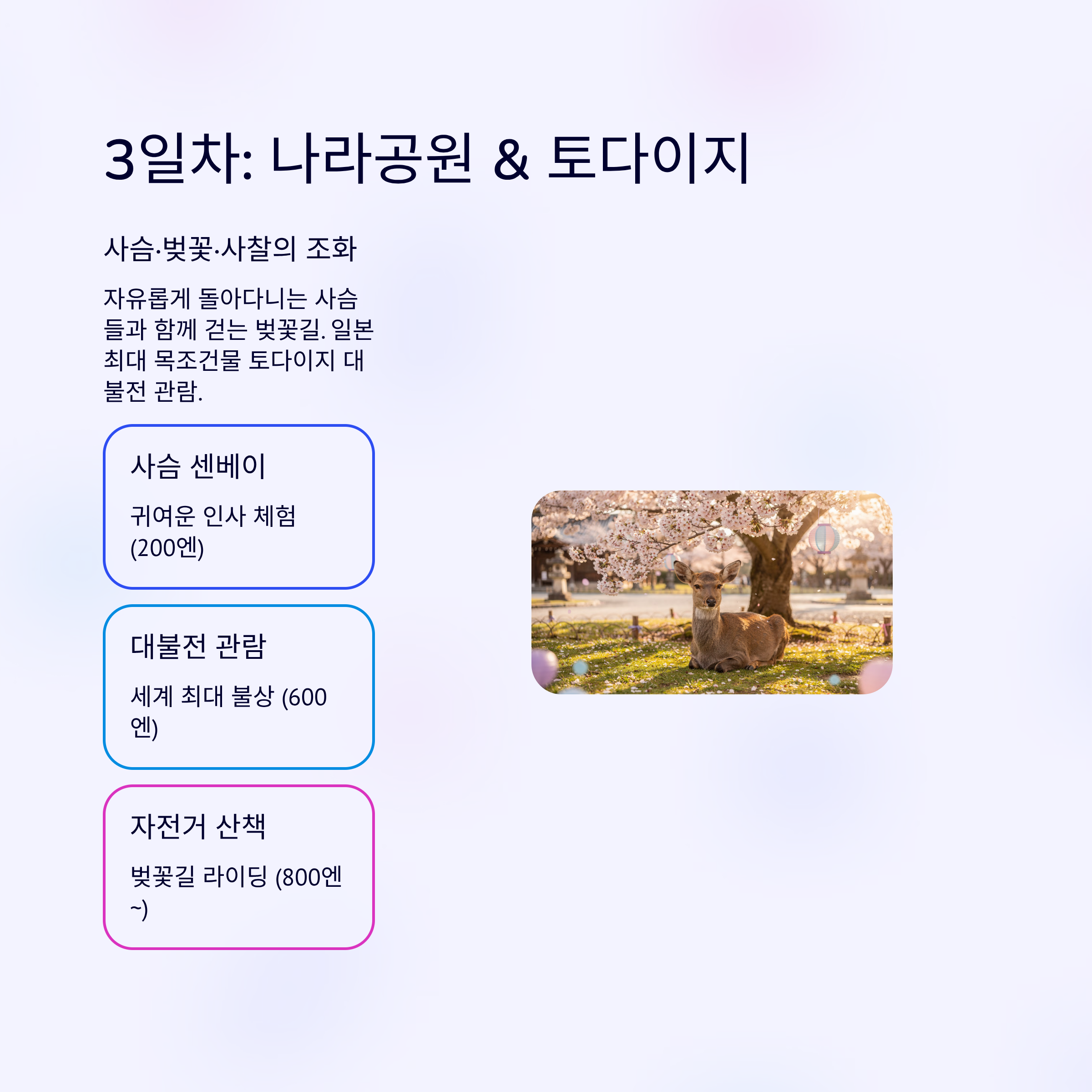 “사슴이 벚꽃 아래에서 졸고 있는 모습, 평생 기억할 장면이에요. 자연과 동물이 어우러진 나라만의 매력에 푹 빠졌어요.”
