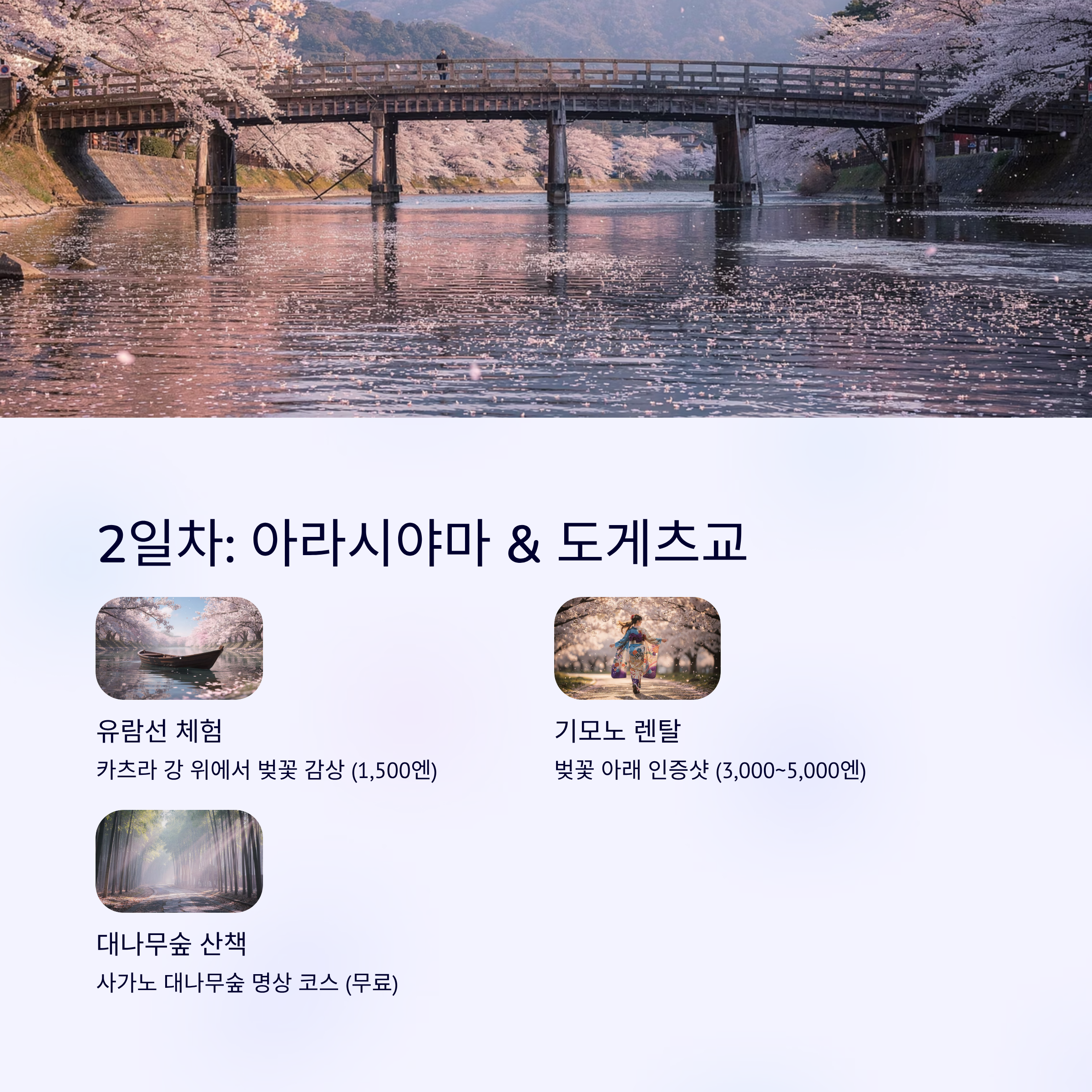 강, 산, 다리, 그리고 벚꽃이 어우러지는 교토의 대표 벚꽃 명소 아라시야마. 전통과 자연이 만나는 이곳은 하루 종일 머물러도 모자랄 정도로 풍성한 볼거리와 체험이 가득합니다.