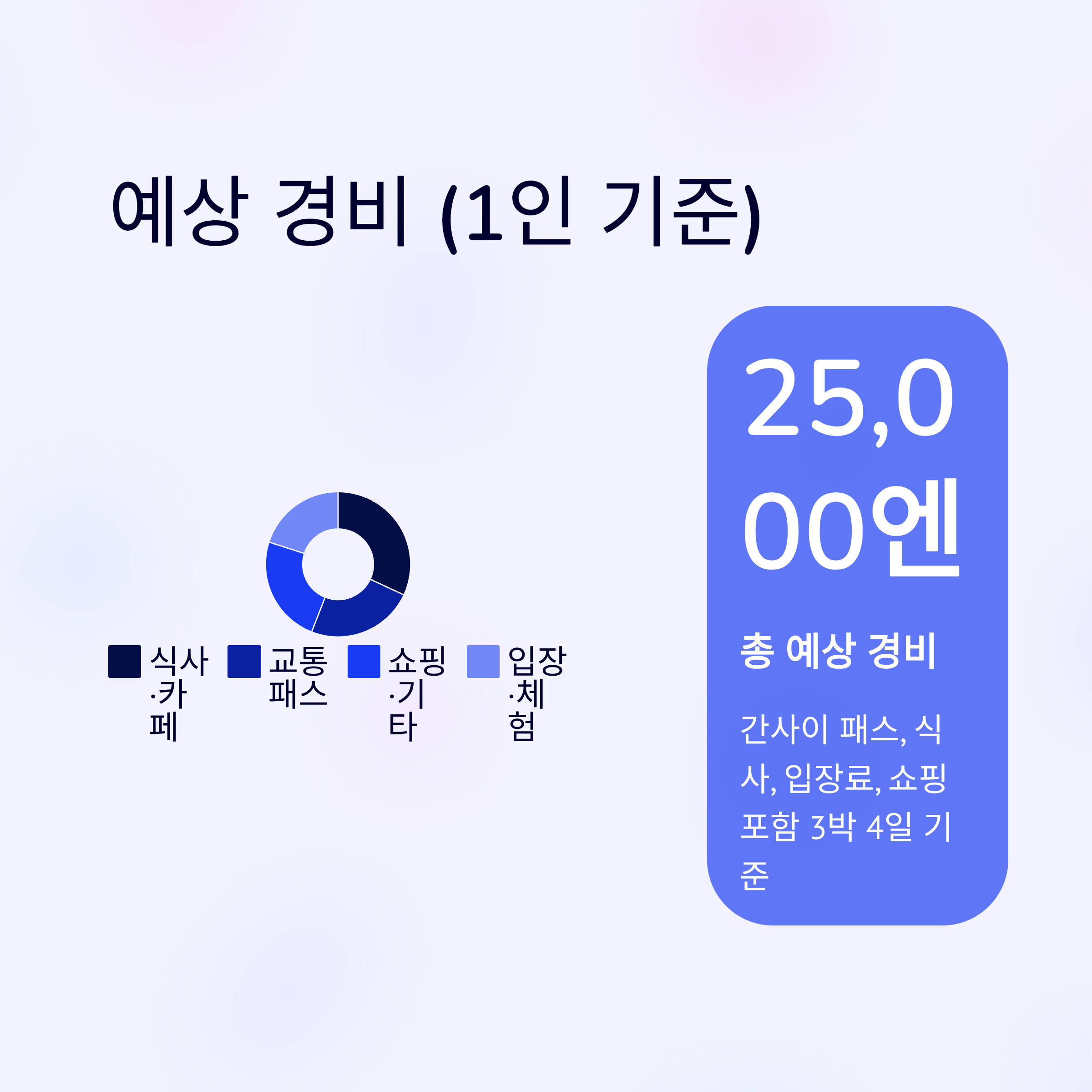 교통 (간사이 패스) 약 6,000 식사 및 카페 약 8,000 입장 및 체험비 약 5,000 쇼핑 및 기타 약 6,000 총합계 약 25,000엔
