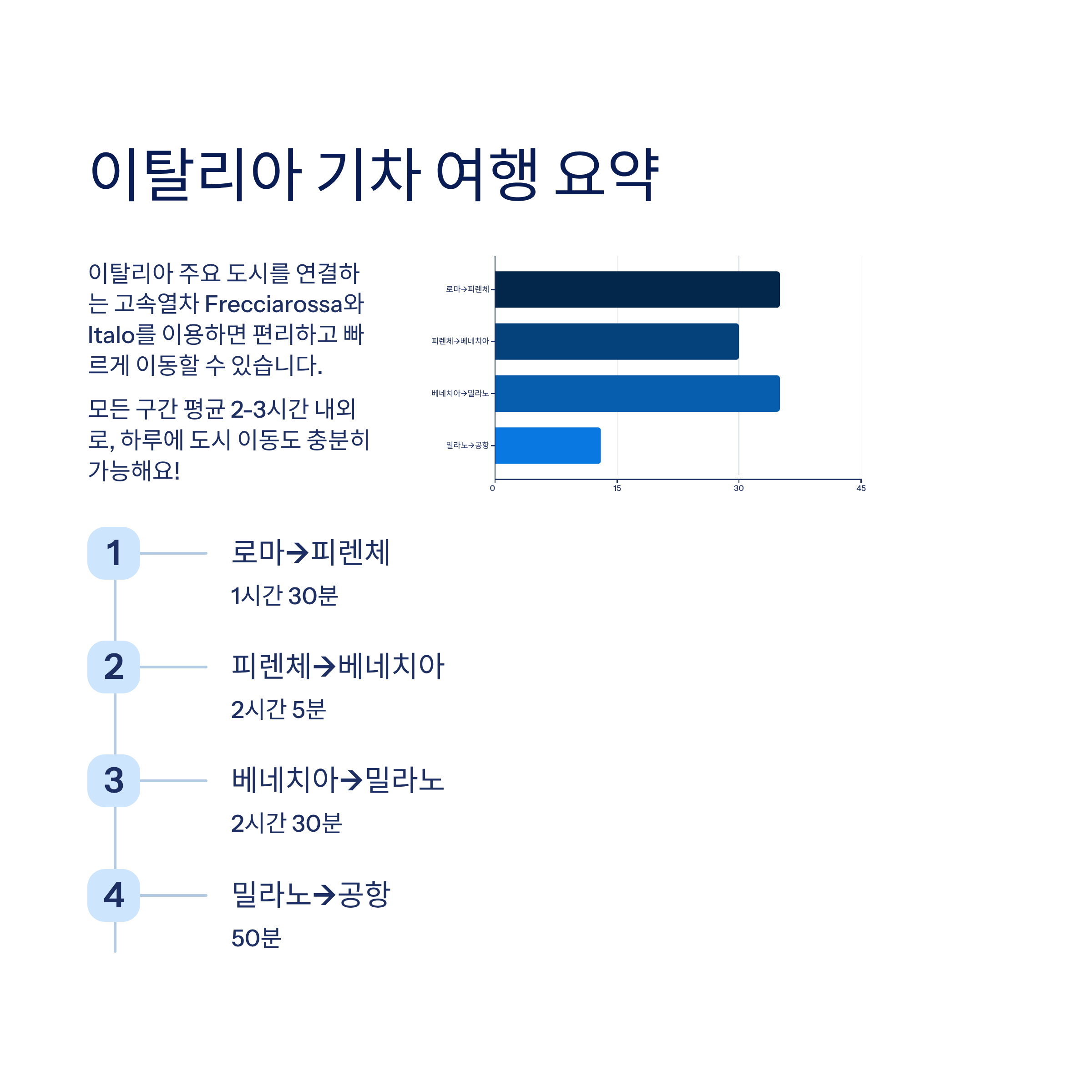 로마 → 피렌체 Frecciarossa / Italo 1시간 30분 25~45유로 피렌체 → 베네치아 Frecciarossa / Italo 2시간 5분 20~40유로 베네치아 → 밀라노 Frecciarossa / Italo 2시간 30분 25~45유로 밀라노 → 말펜사 공항 Malpensa Express 약 50분 13유로