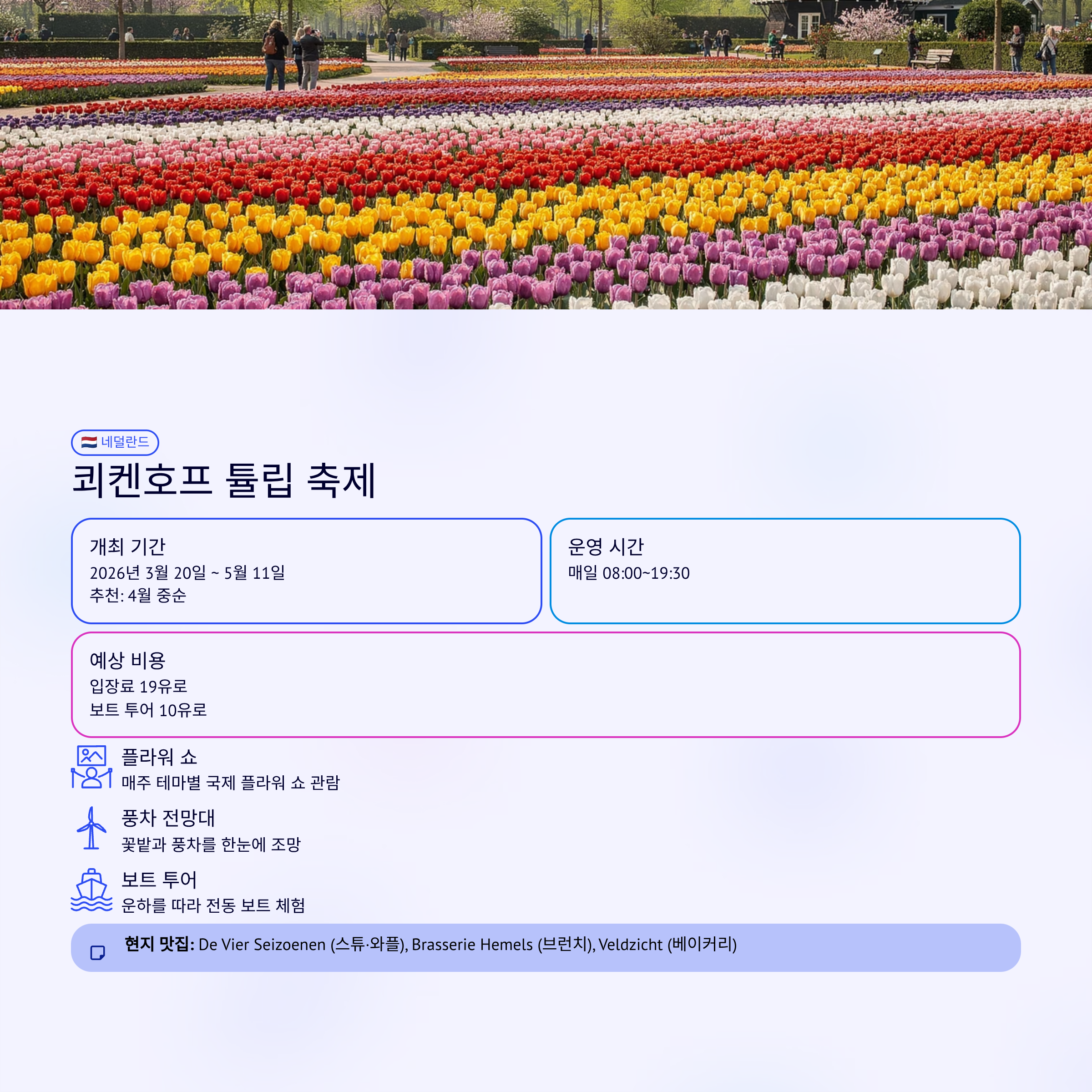 4월, 유럽 전역은 봄꽃의 향연으로 물듭니다. 특히 서유럽에서는 다양한 국가에서 계절의 시작을 알리는 아름다운 꽃축제들이 열리며, 해마다 수백만 명의 관광객이 몰려듭니다. 튤립으로 가득한 네덜란드, 인상주의 화가 모네의 정원이 살아 숨쉬는 프랑스 지베르니, 고즈넉한 전원 마을이 벚꽃으로 물드는 영국 코츠월드까지. 이번 글에서는 SNS와 여행자 커뮤니티를 통해 주목받고 있는 세 곳의 대표 봄꽃축제를 일정 정보부터 즐길 거리, 포토스팟, 지역 맛집까지 전부 소개해드립니다.