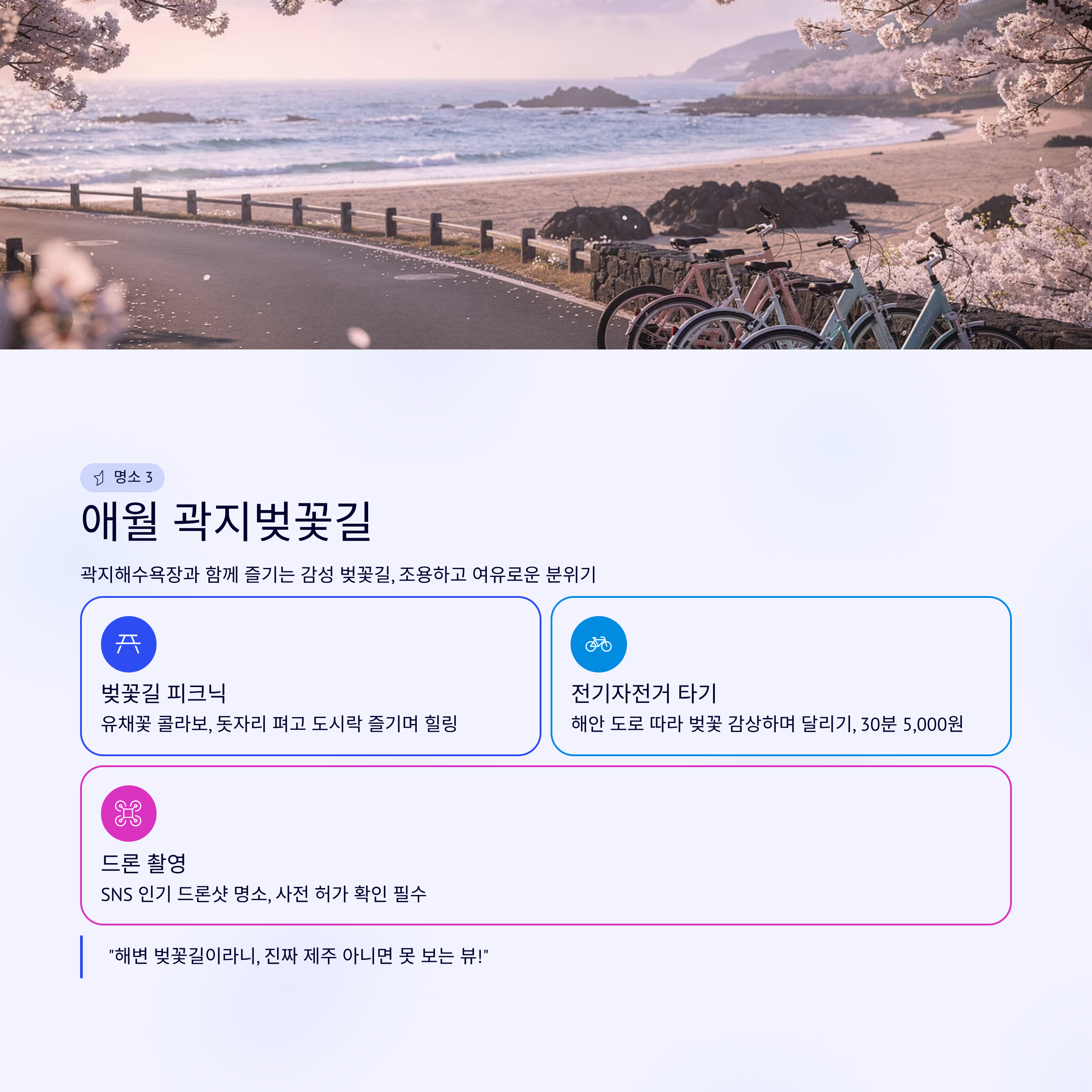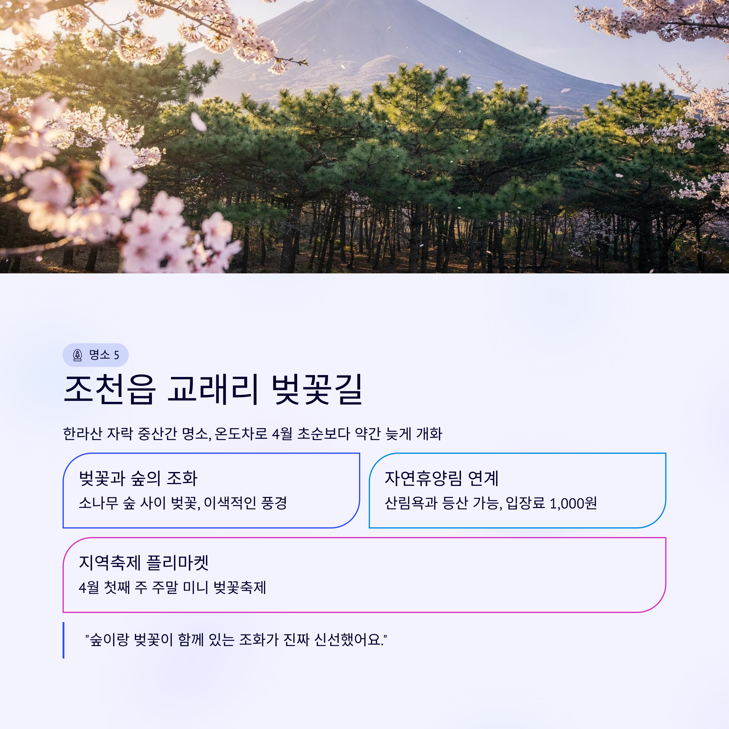 전농로 도심 벚꽃터널 오후~야경 입구 아치, 조명 벚꽃 무료~3천원 천지연 폭포 + 벚꽃 오전~오후 전망대, 폭포 옆 2천원 곽지 해변 벚꽃길 오전 바다뷰 벚꽃길 무료~5천원 협재 돌담 + 조용한 길 오전~낮 돌담길 포인트 무료 교래리 숲속 벚꽃 오후 원두막, 숲길 1천원