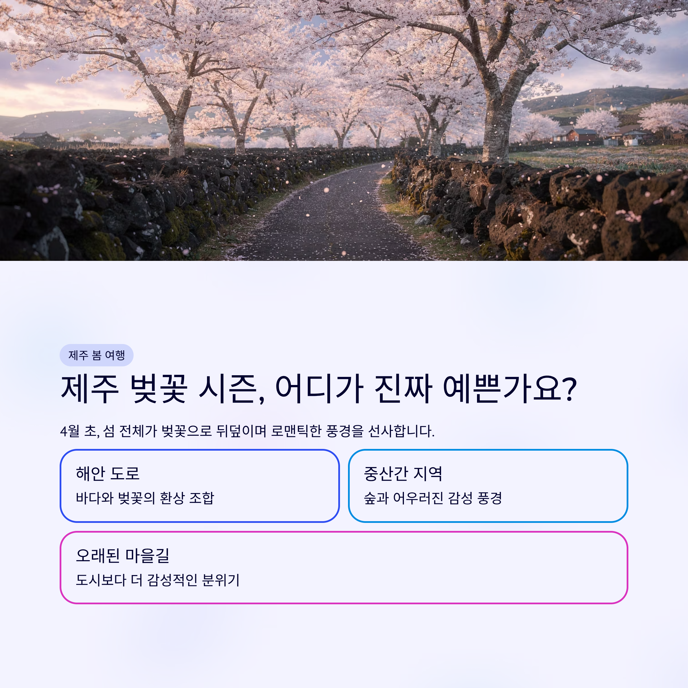 4월 초, 섬 전체가 벚꽃으로 뒤덮이며 로맨틱한 풍경을 선사합니다.특히 제주는 해안 도로와 중산간 지역, 오래된 마을길까지 곳곳에 벚꽃이 피어나기 때문에 도시보다 더 감성적인 분위기를 느낄 수 있어요.