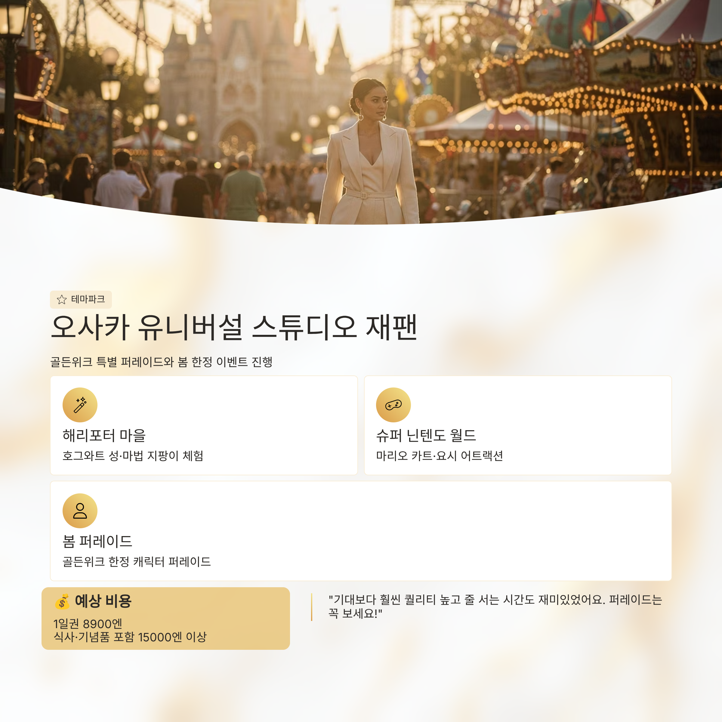 일본 최고의 테마파크 중 하나로, 골든위크 기간엔 각종 특별 퍼레이드와 봄 한정 이벤트가 진행됩니다.즐길거리 상세