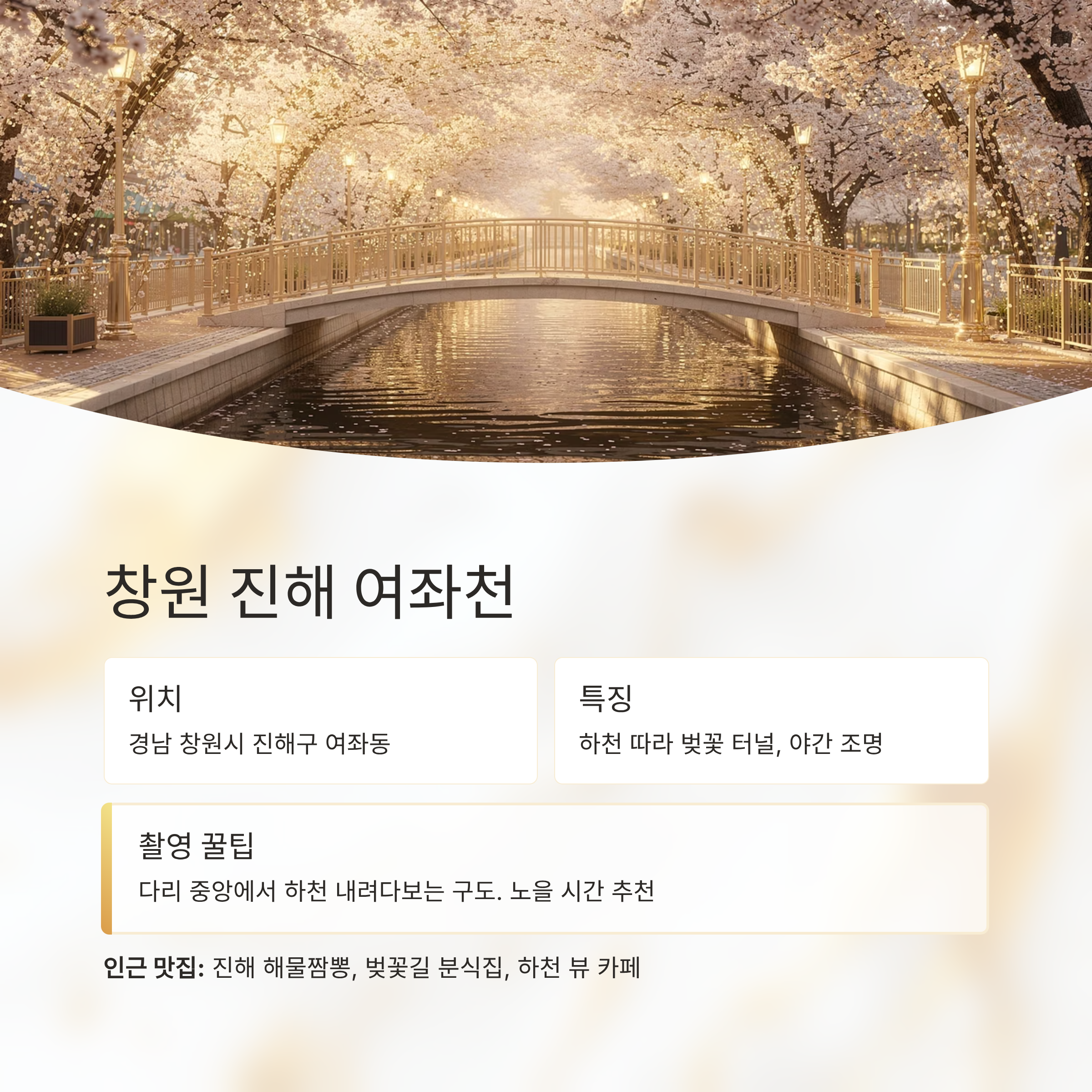 하천을 따라 벚꽃이 길게 이어져 있습니다.방문 장소 및 즐길거리