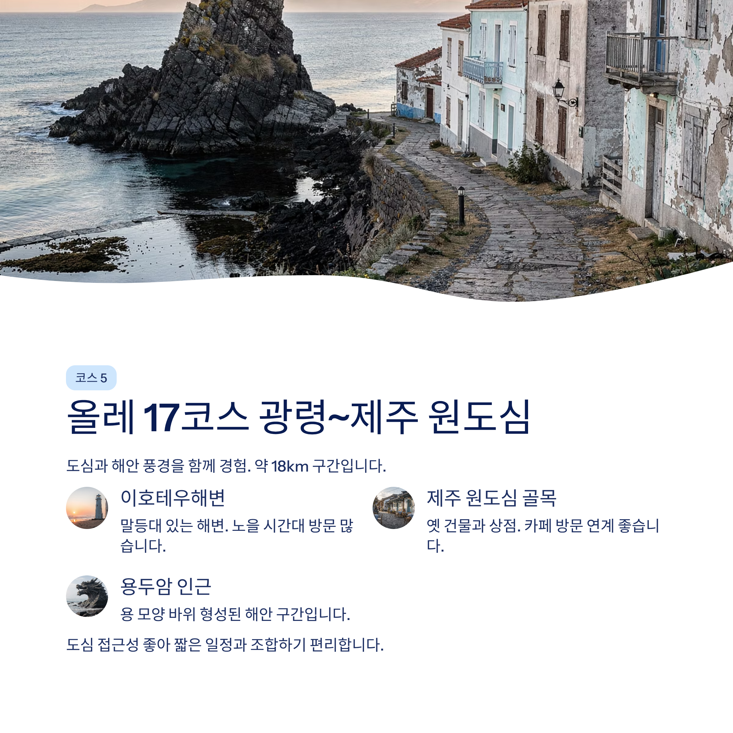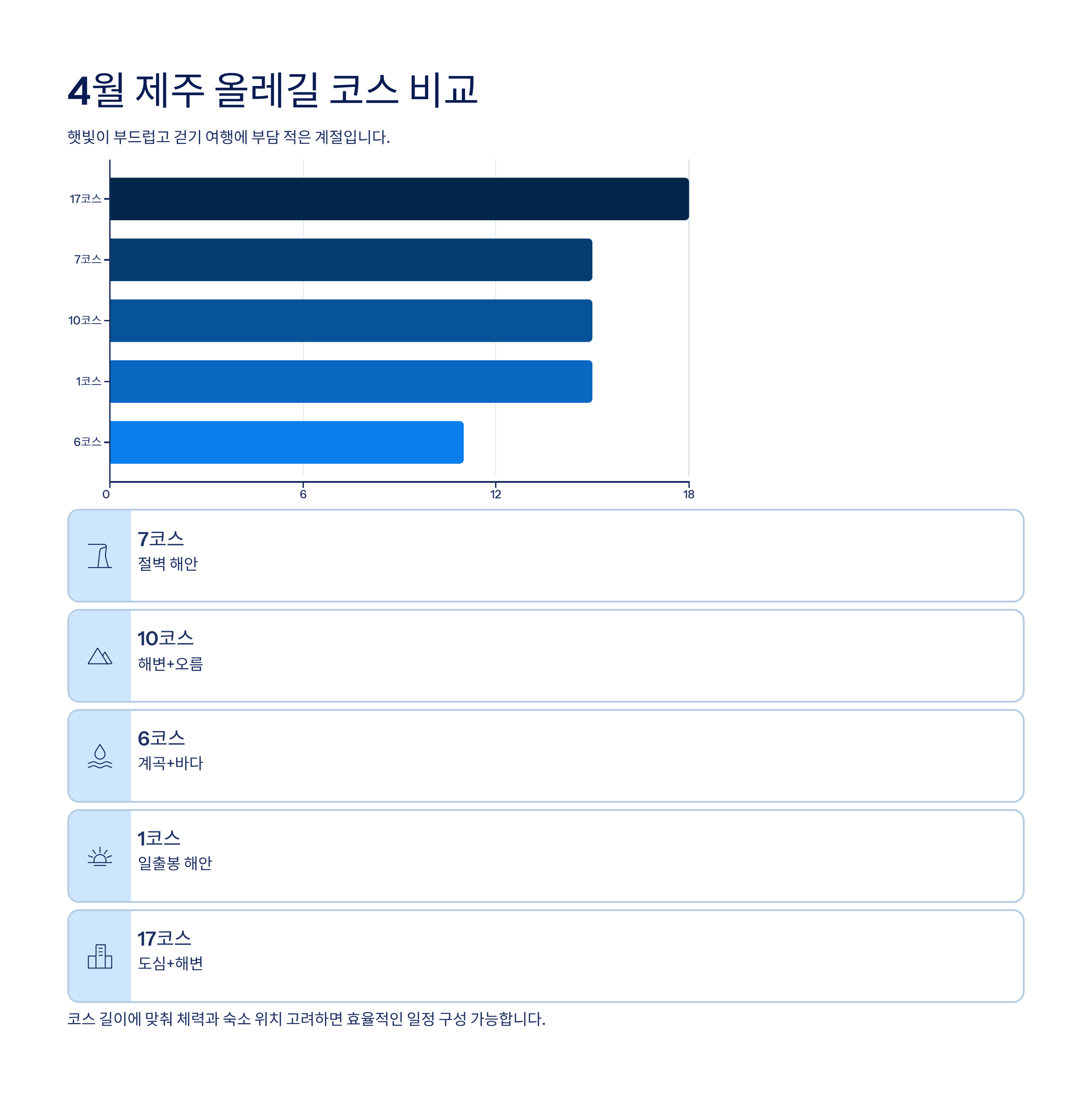7코스 약 15km 4~5시간 절벽 해안 10코스 약 15km 4시간 해변+오름 6코스 약 11km 3~4시간 계곡+바다 1코스 약 15km 4시간 일출봉 해안 17코스 약 18km 4~5시간 도심+해변 4월 제주는 햇빛이 부드럽고