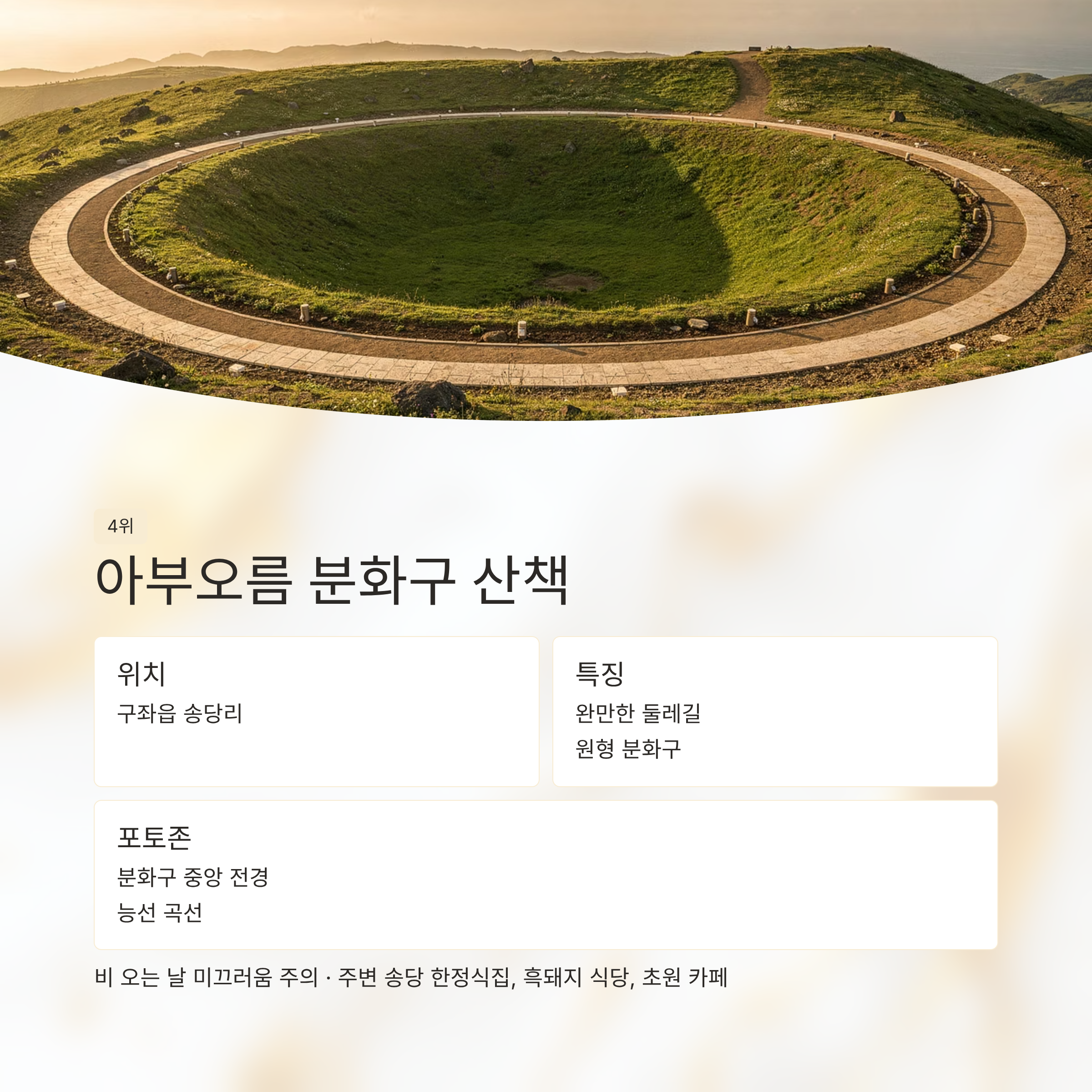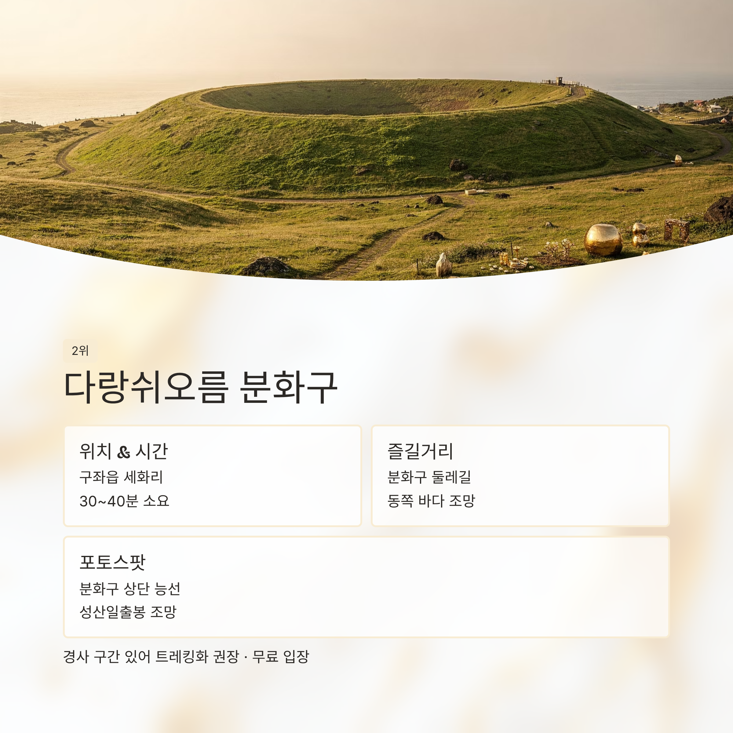 새별오름 30분 쉬움 노을 다랑쉬오름 40분 중 오전 용눈이오름 30분 쉬움 낮 아부오름 30분 쉬움 오후 금오름 40분 중 일몰 4월 제주 오름은