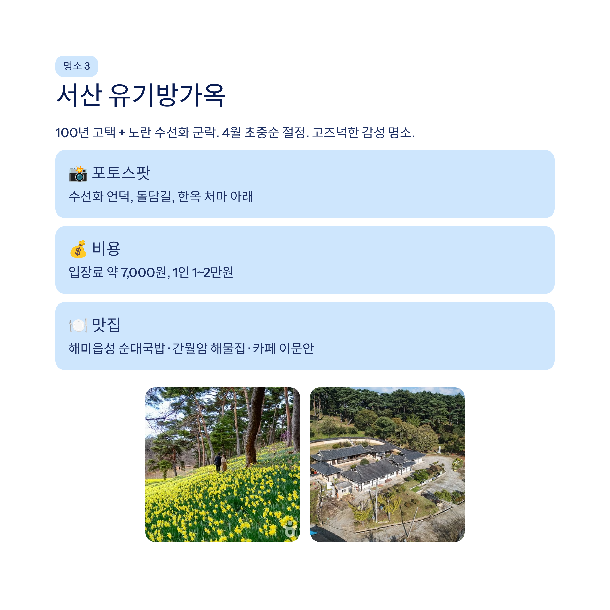 소개 : 100년 고택과 노란 수선화가 어우러진 봄 감성 명소. 4월 초중순 수선화 절정 시기 방문 추천.