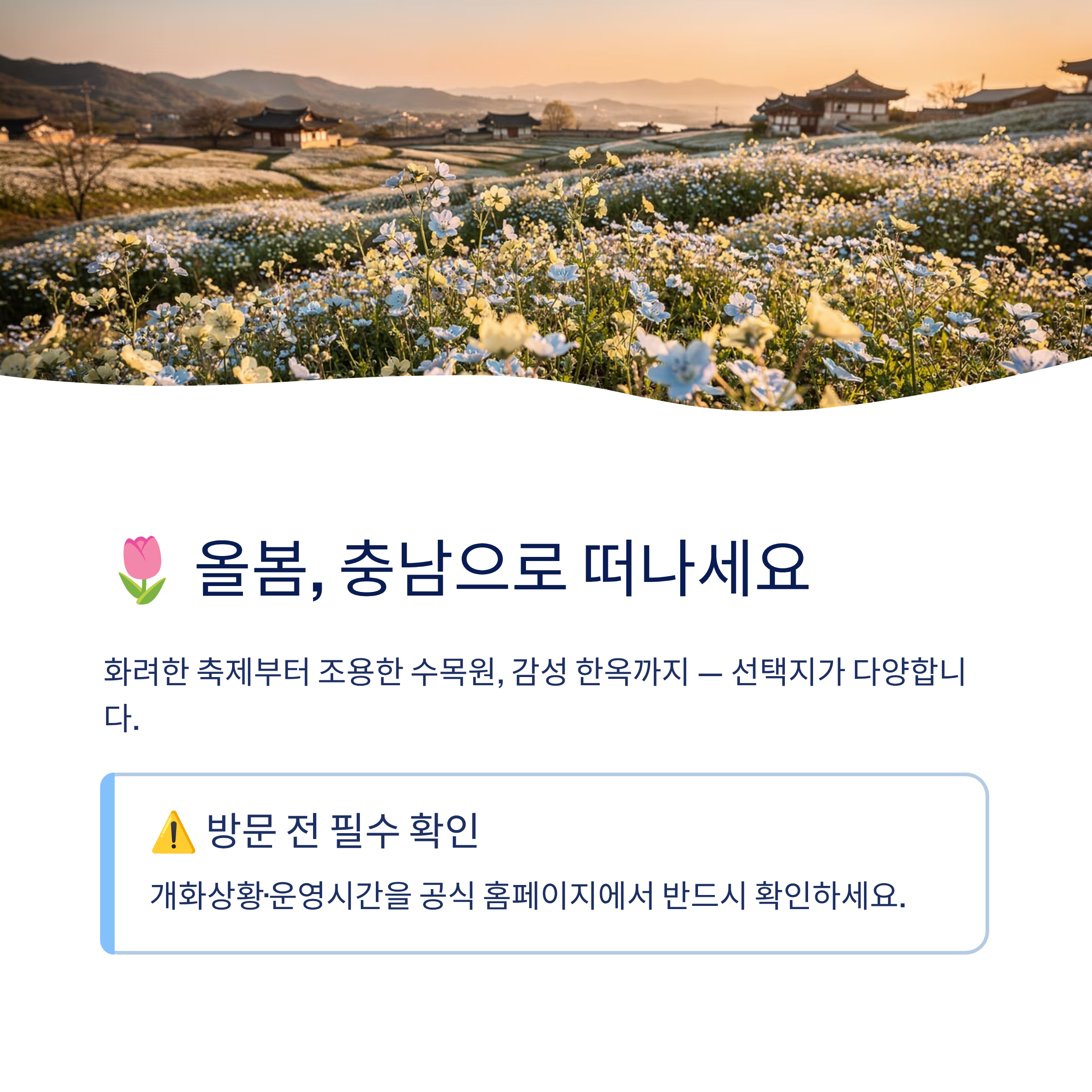 따뜻한 봄바람이 불어오는 4월, 충남은 형형색색 꽃물결로 여행자의 마음을 설레게 합니다. SNS에서도 매년 화제가 되는 대표 봄꽃 명소 3곳을 모아, 방문 팁부터 포토스팟, 예상비용, 인근 맛집까지 정리했습니다.