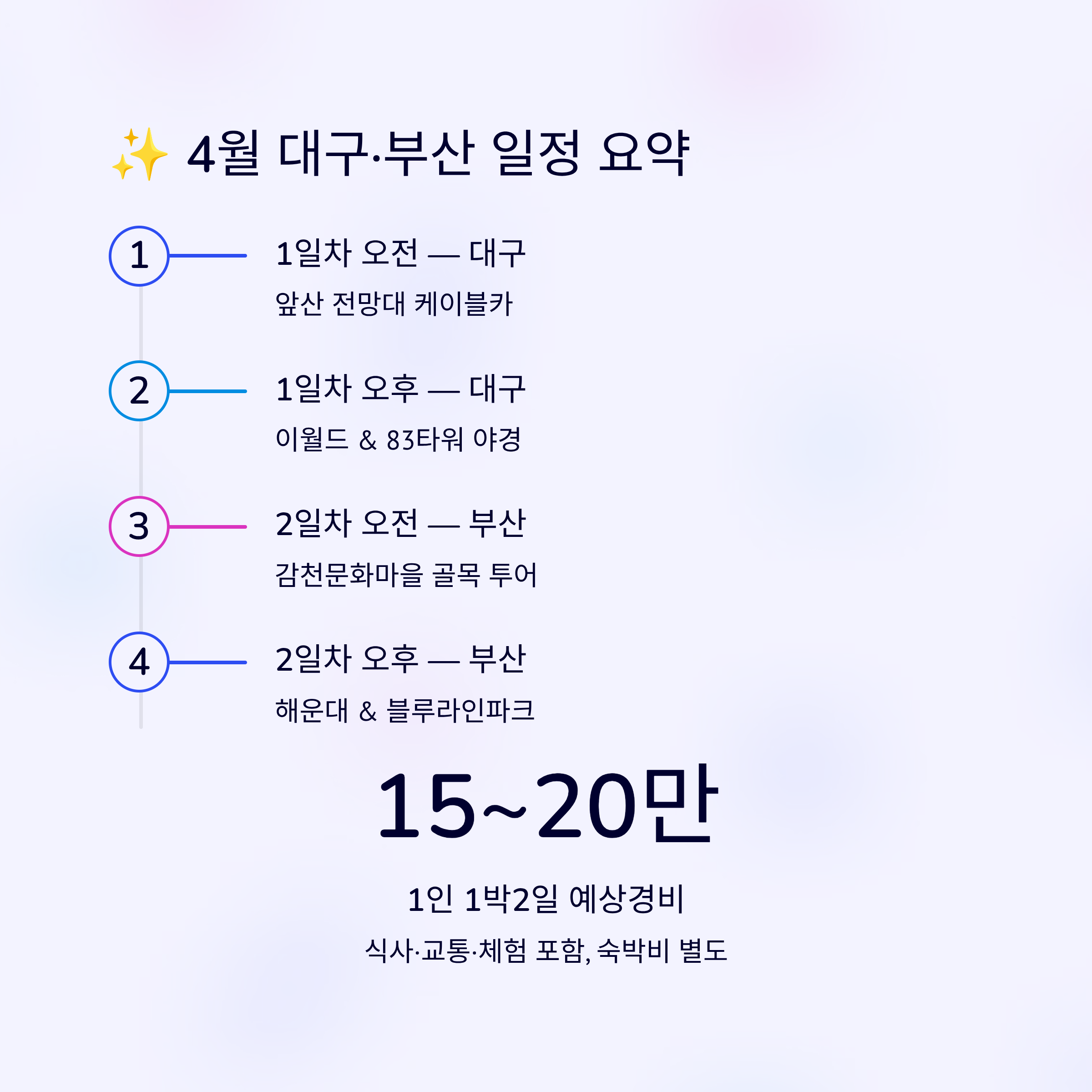 오전 앞산 전망대 감천문화마을 오후 이월드 & 83타워 해운대 & 블루라인 추천포인트 도심 야경 바다 감성 1인 예상경비 약 7~10만 원 약 8~12만 원 ✔ 전체 1인 1박2일 기준 평균 15~20만 원 예상 (식사·교통·체험 포함, 숙박비 별도)