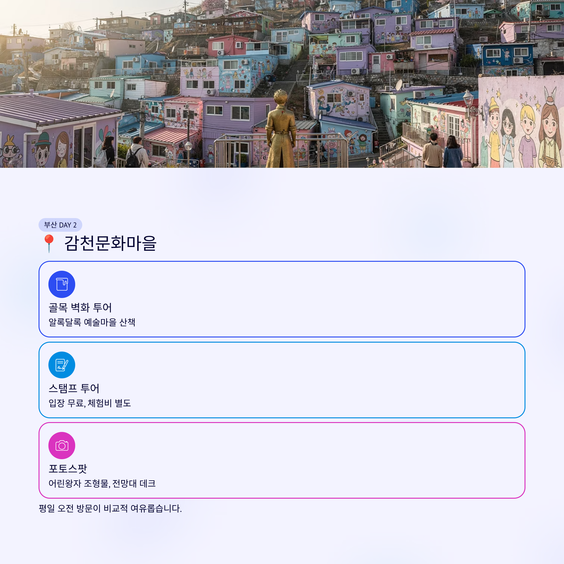 “사진 찍기 좋은 마을”이라는 평가가 많으며, 평일 오전 방문이 비교적 여유롭습니다.