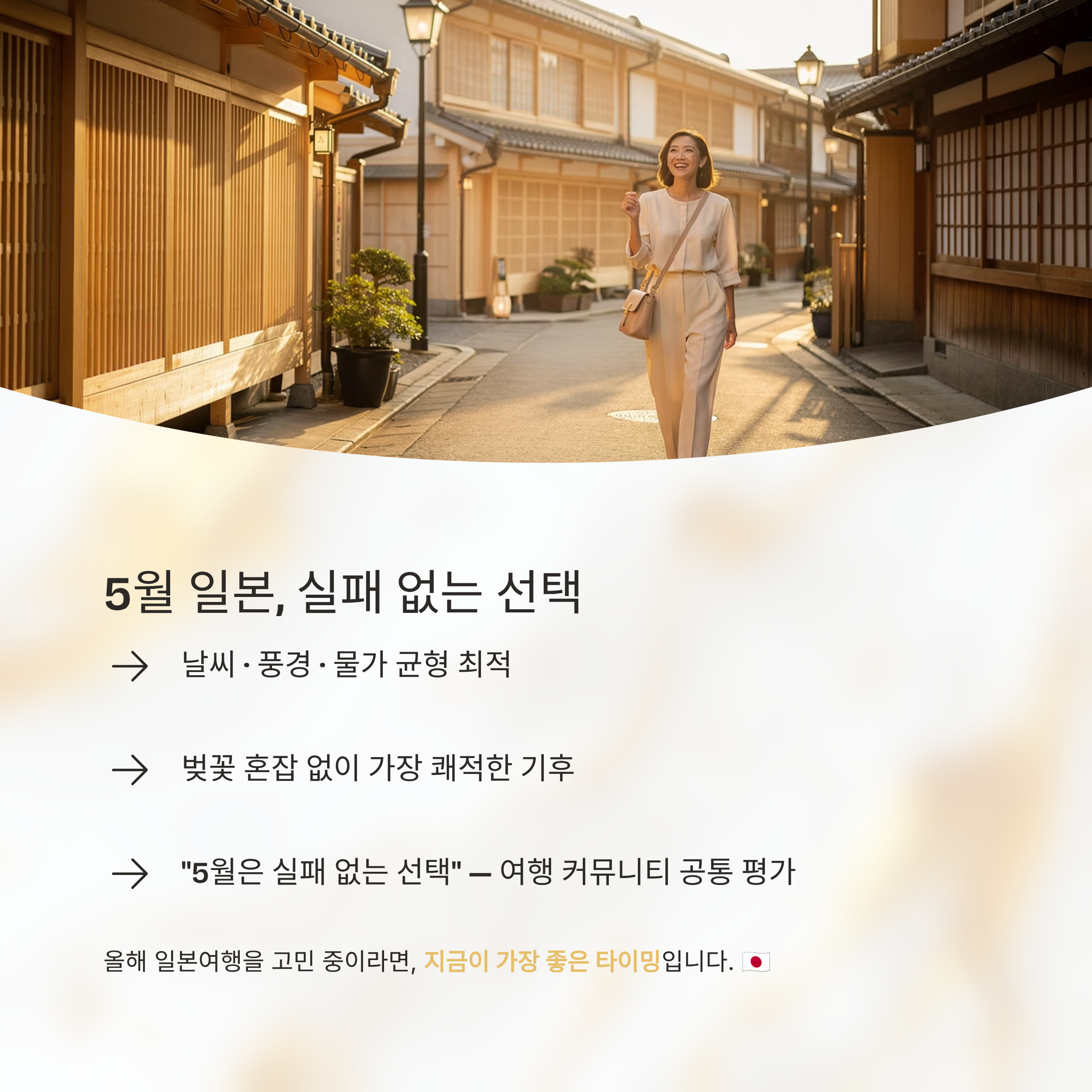 5월 일본은 날씨, 풍경, 체감 물가까지 균형이 좋은 시기입니다. 벚꽃 성수기 혼잡을 피하면서도 가장 쾌적한 기후를 즐길 수 있는 달이죠. 여행 커뮤니티에서도 “5월은 실패 없는 선택”이라는 평가가 많은 이유입니다. 올해 일본여행을 고민 중이라면, 지금이 가장 좋은 타이밍입니다.