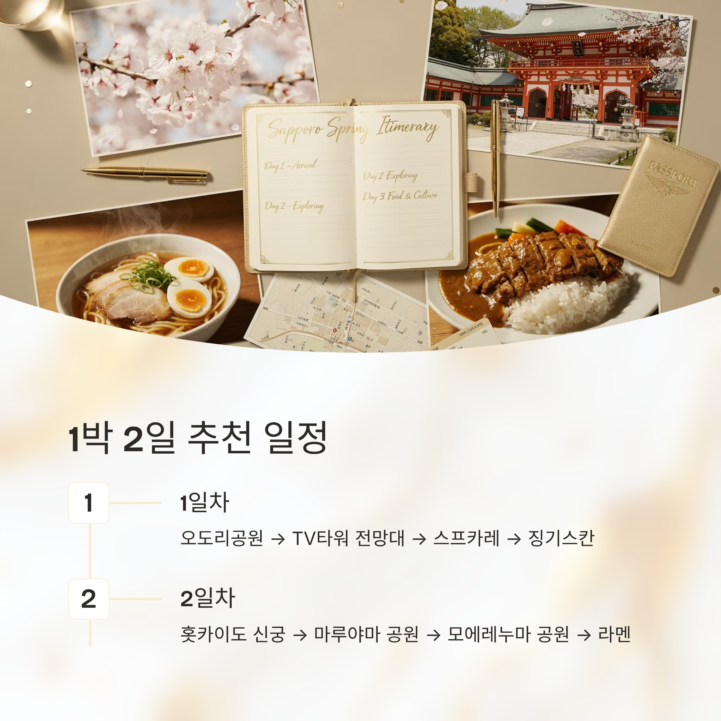 1일차 오도리공원 → TV타워 전망대 → 스프카레 → 징기스칸 2일차 홋카이도 신궁 → 마루야마 공원 → 모에레누마 공원 → 라멘
