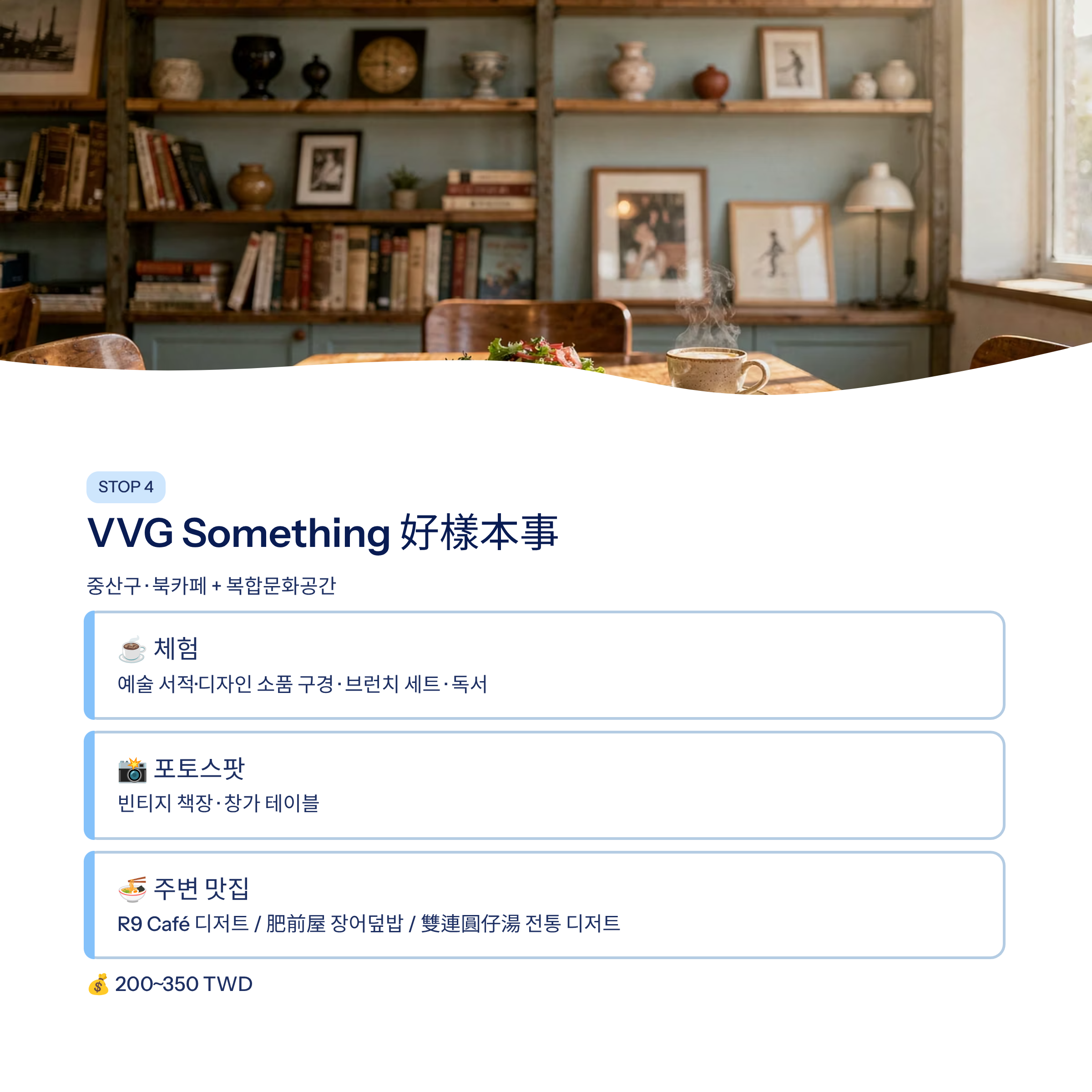 오전 阜杭豆漿 → Simple Kaffa 아침+스페셜티 350 TWD 오후 융캉제 카페 투어 거리 감성 250 TWD 저녁 101 인근 % Arabica 야경 250 TWD 마무리 중산 VVG 브런치·독서 300 TWD 총합 약 1,150 TWD (약 5만원대)