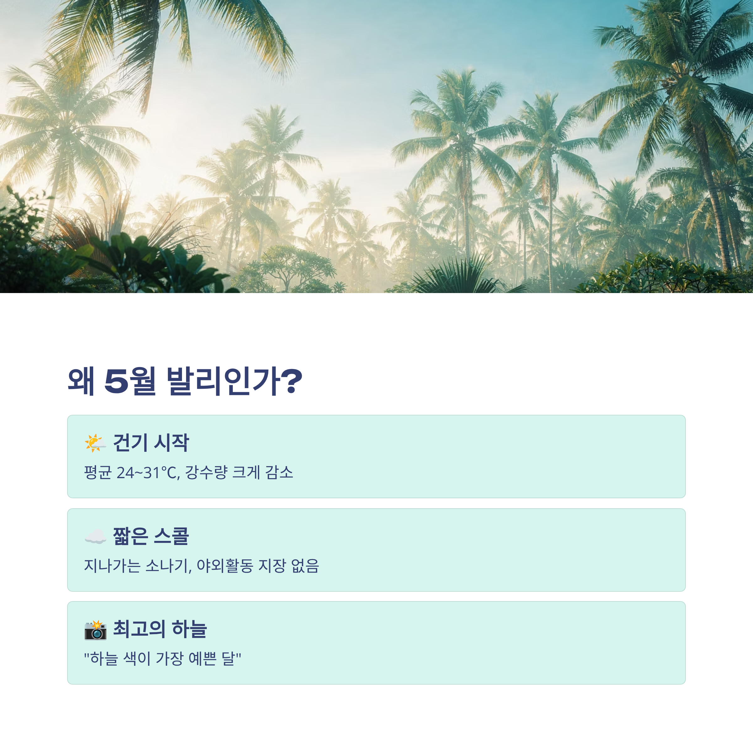 5월 발리는 건기 시작 시점으로, 평균기온 24~31℃, 습도는 여전히 있지만 1~3월 대비 강수량이 크게 줄어드는 시기입니다. 스콜이 있더라도 짧게 지나가는 경우가 많아 리조트 휴양과 야외활동 모두 만족도가 높은 달로 평가됩니다. SNS 후기에서도 “덥지만 그늘은 선선하다”, “하늘 색이 가장 예쁜 달”이라는 반응이 많습니다.