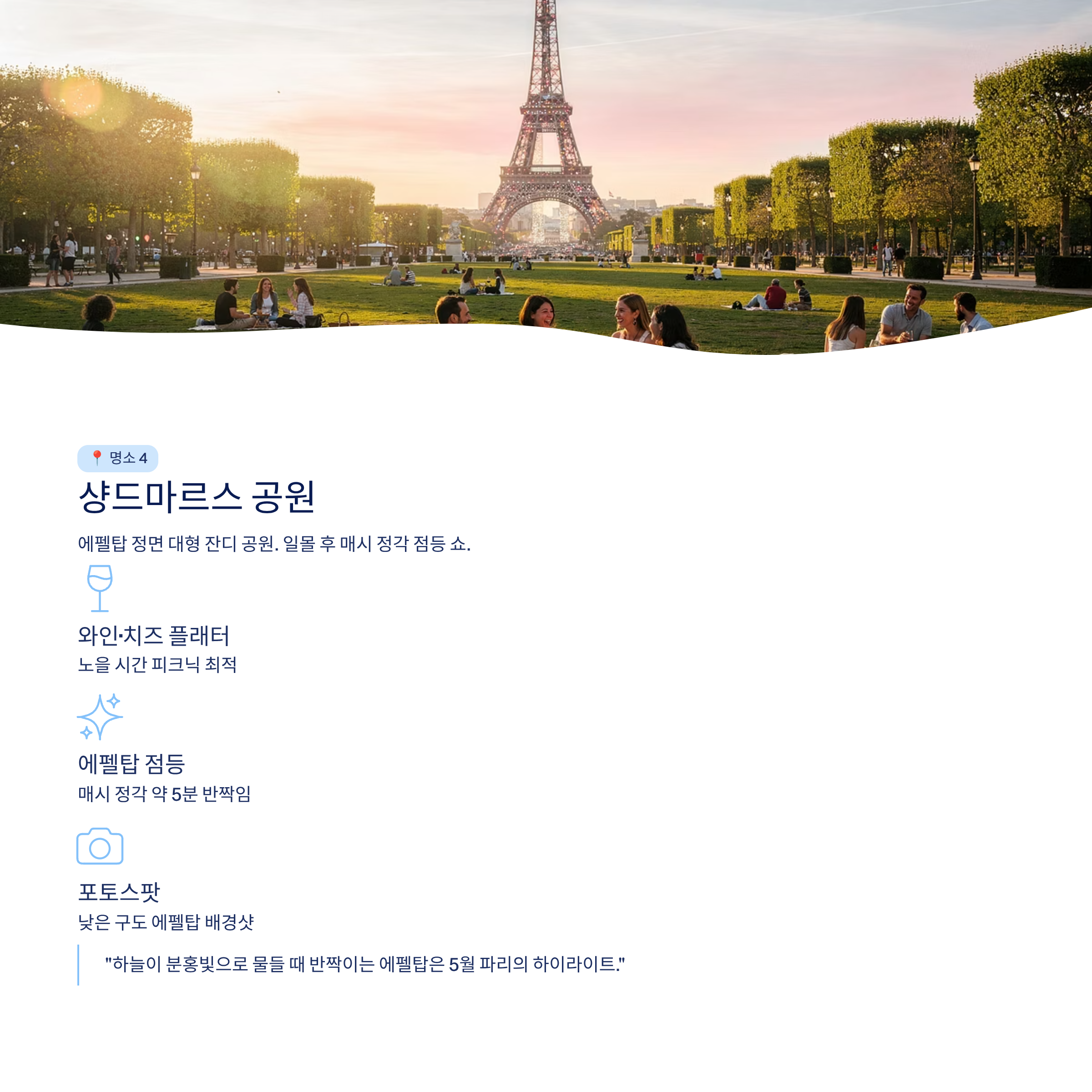 - 특징: 에펠탑을 정면으로 볼 수 있는 대형 잔디 공원