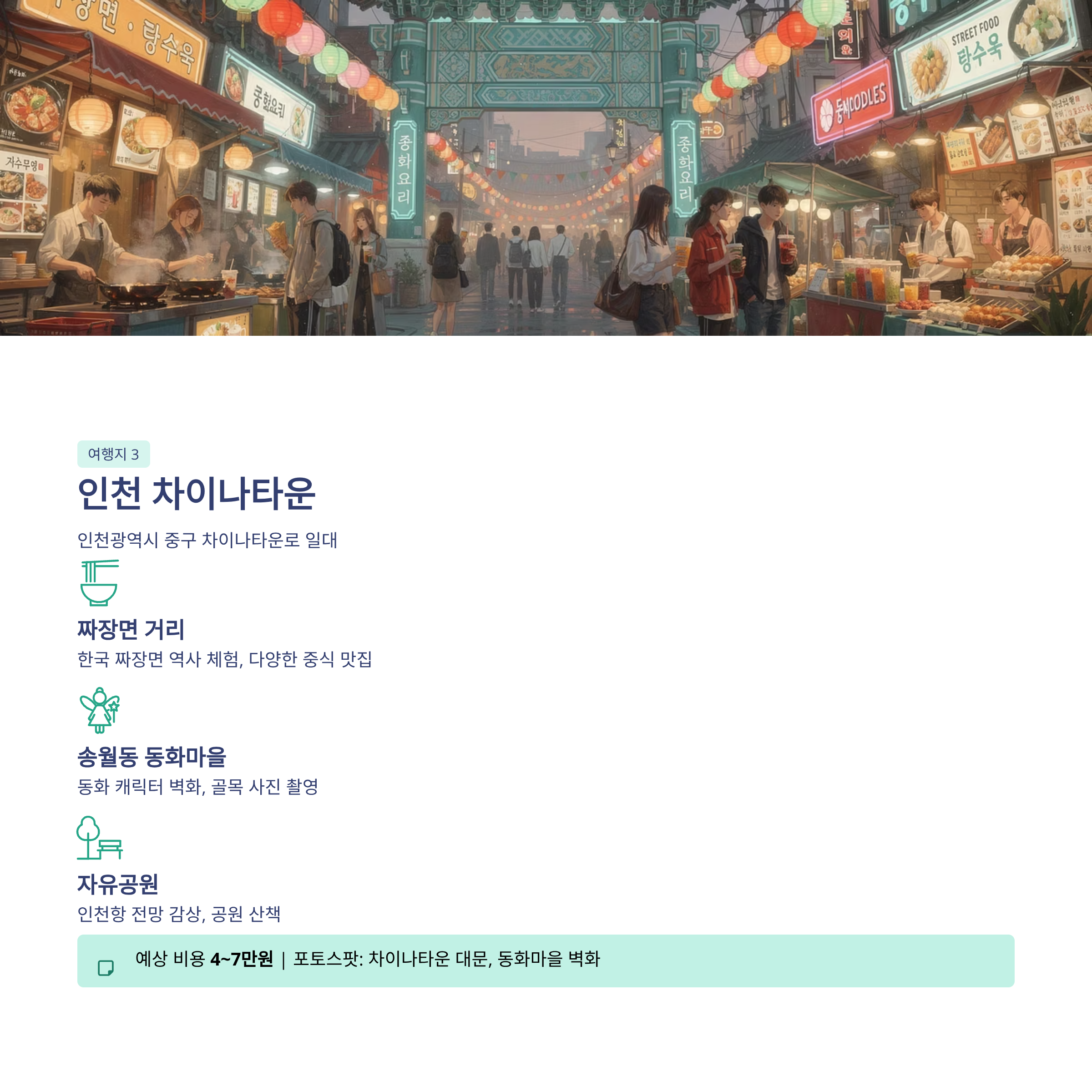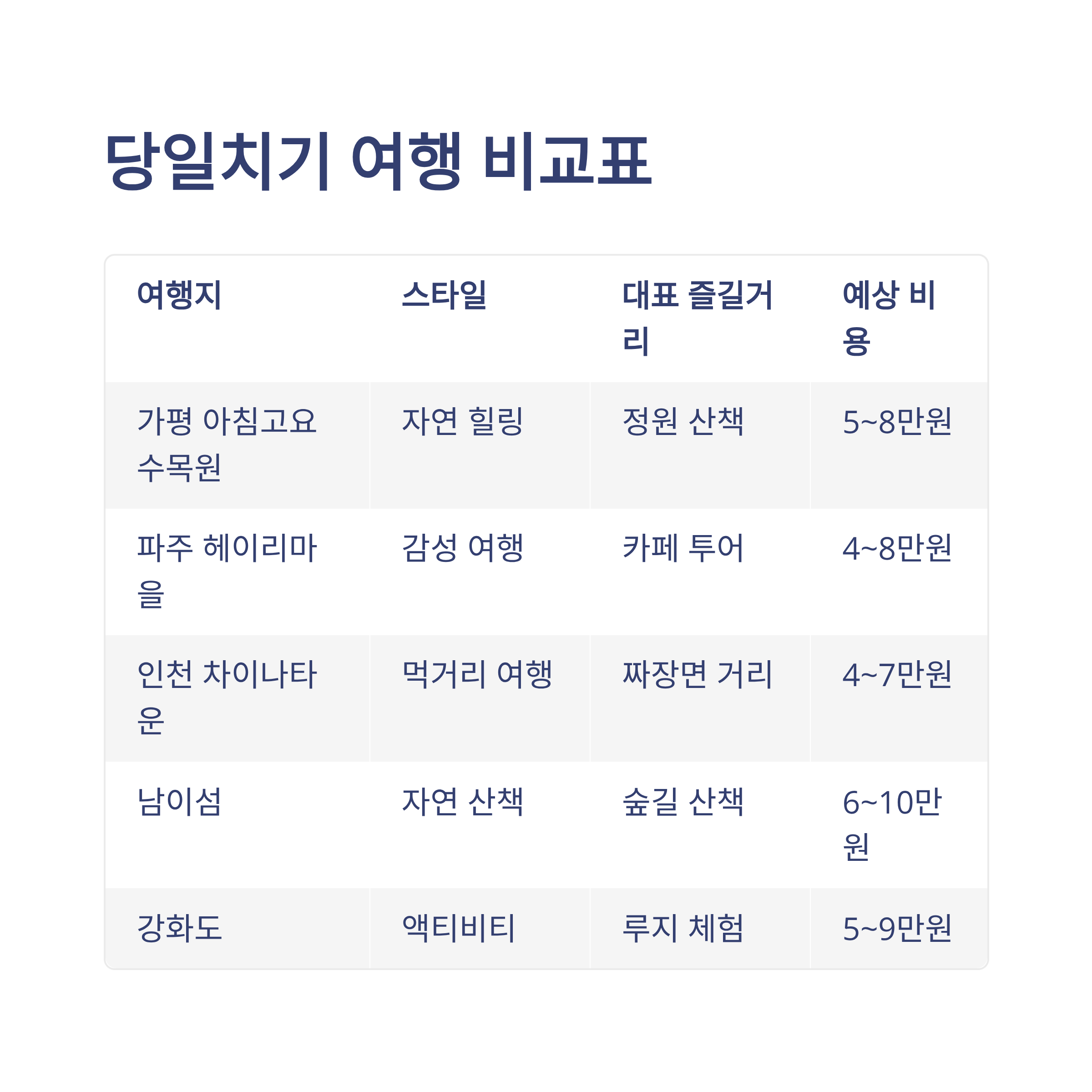 가평 아침고요수목원 자연 힐링 정원 산책 5~8만원 파주 헤이리마을 감성 여행 카페 투어 4~8만원 인천 차이나타운 먹거리 여행 짜장면 거리 4~7만원 남이섬 자연 산책 숲길 산책 6~10만원 강화도 액티비티 여행 루지 체험 5~9만원