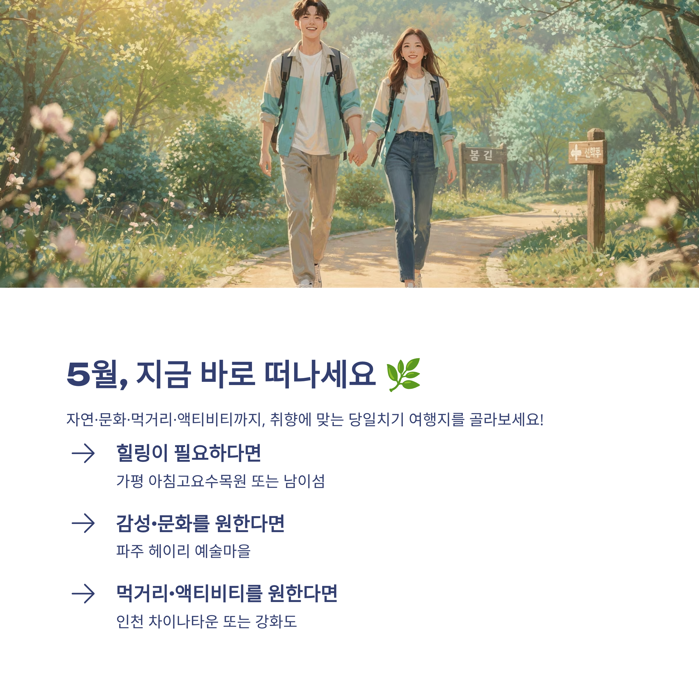 5월은 따뜻한 날씨와 초록 자연 풍경이 어우러지는 시기로 당일치기 여행을 떠나기 가장 좋은 계절입니다. 특히 최근 SNS(인스타그램, 네이버 여행 카페, 블로그 후기)에서 많이 언급되는 여행지는 가평 아침고요수목원, 파주 헤이리 예술마을, 인천 차이나타운, 남이섬, 강화도입니다. 서울 및 수도권에서 접근성이 좋아 부담 없이 다녀오기 좋은 여행지로 많은 사람들이 찾고 있습니다. 🌿🚗