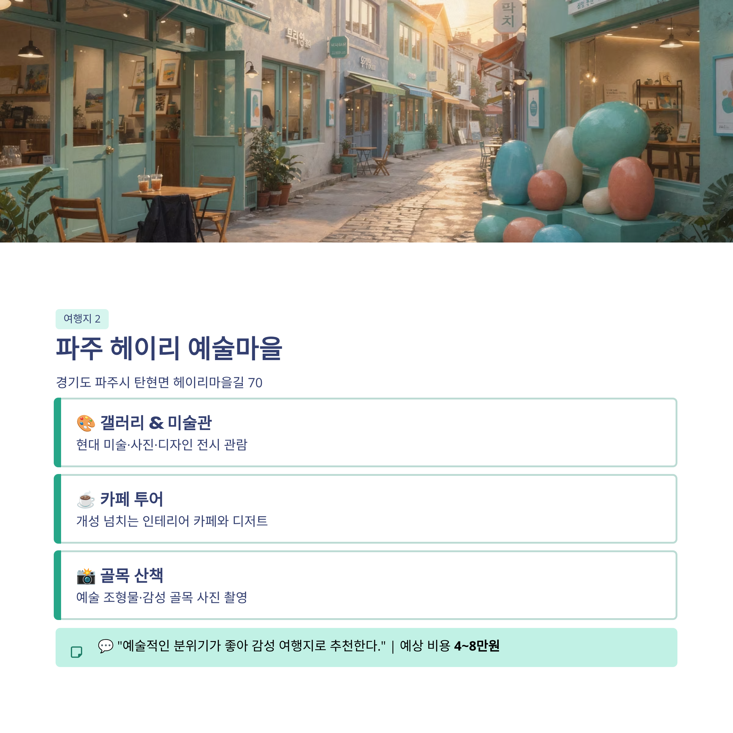 예술가들이 모여 만든 문화예술 마을로 갤러리, 전시관, 감성 카페가 많은 여행지입니다.