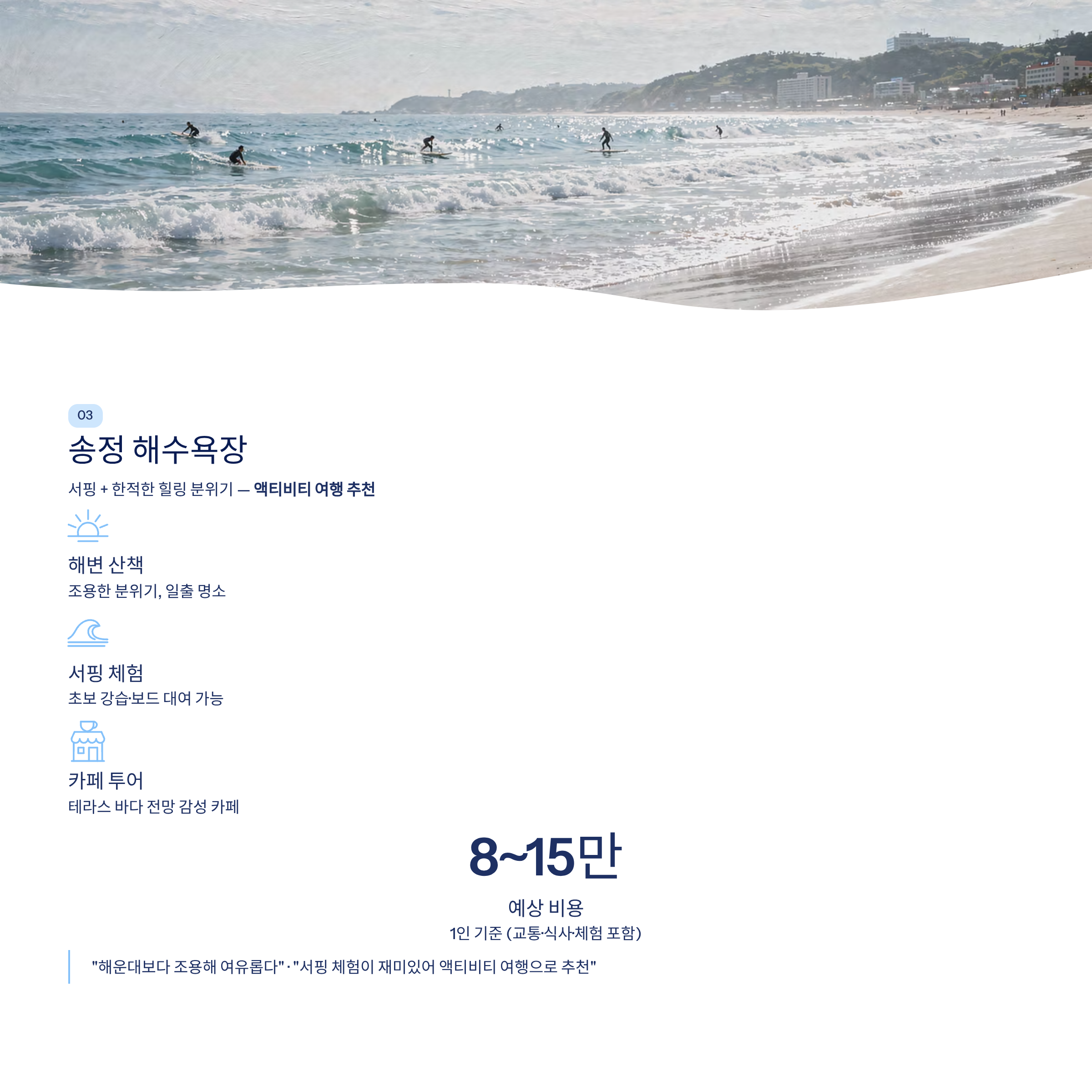 송정은 해운대에서 약 20분 정도 거리에 있는 해변으로 서핑과 여유로운 분위기가 특징입니다. 비교적 한적한 분위기라 힐링 여행지로 인기가 높습니다.