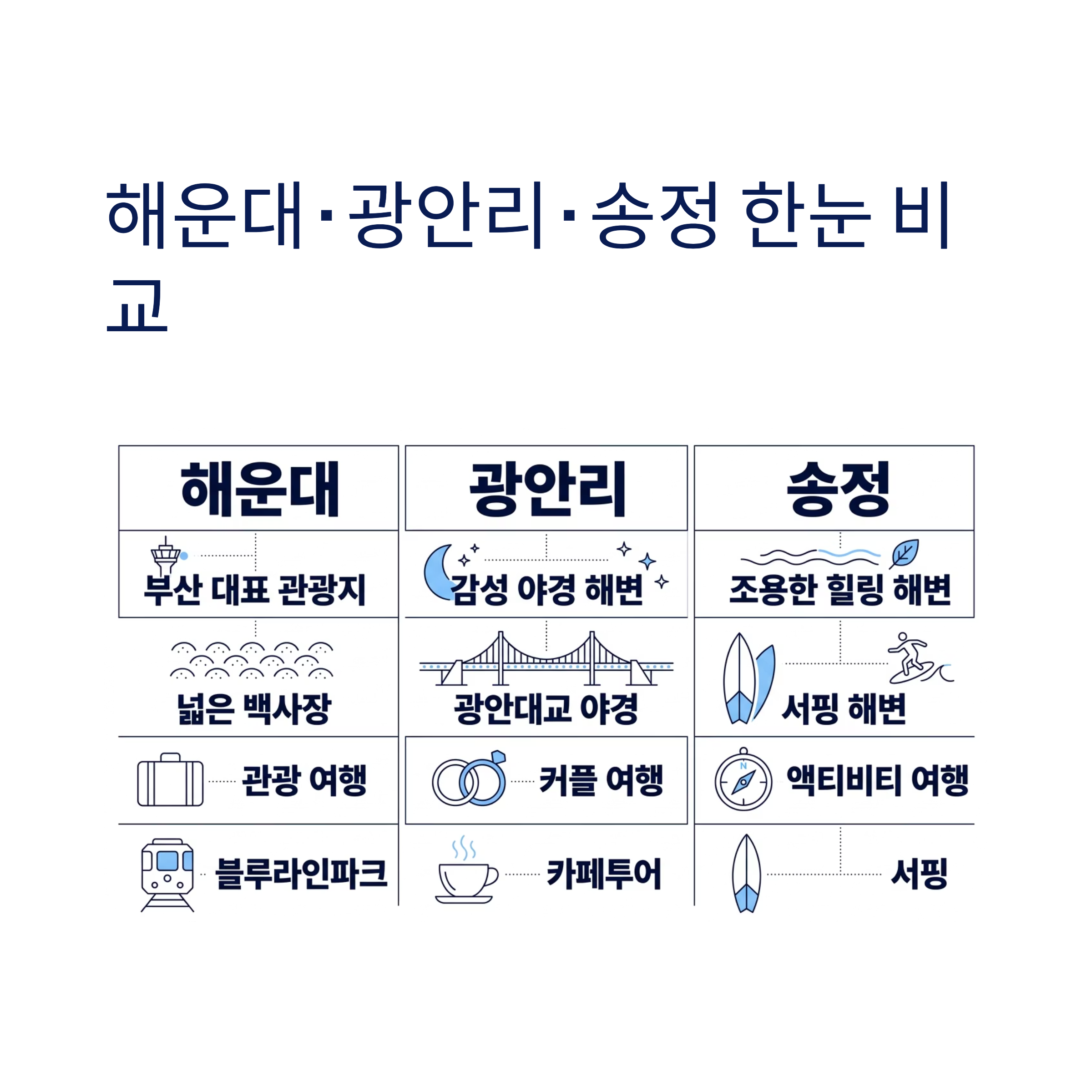 부산을 대표하는 해변인 해운대, 광안리, 송정은 각각 다른 매력을 가지고 있습니다. 해운대는 부산 대표 관광지, 광안리는 아름다운 야경과 카페 여행, 송정은 서핑과 여유로운 분위기를 즐기기 좋은 해변입니다. 세 곳의 거리가 비교적 가까워 하루 일정으로 함께 방문하는 것도 좋은 부산 여행 코스가 됩니다. 🌊