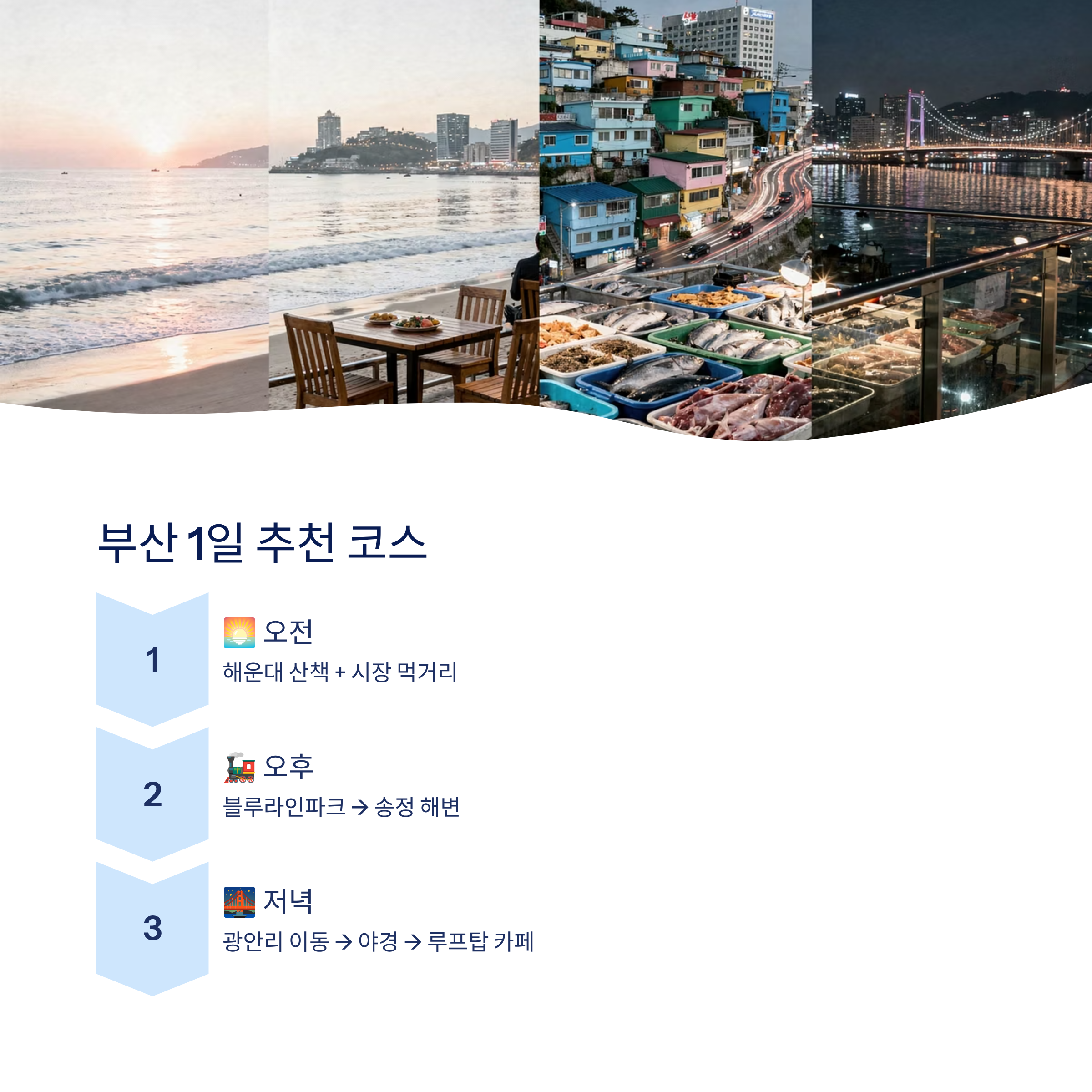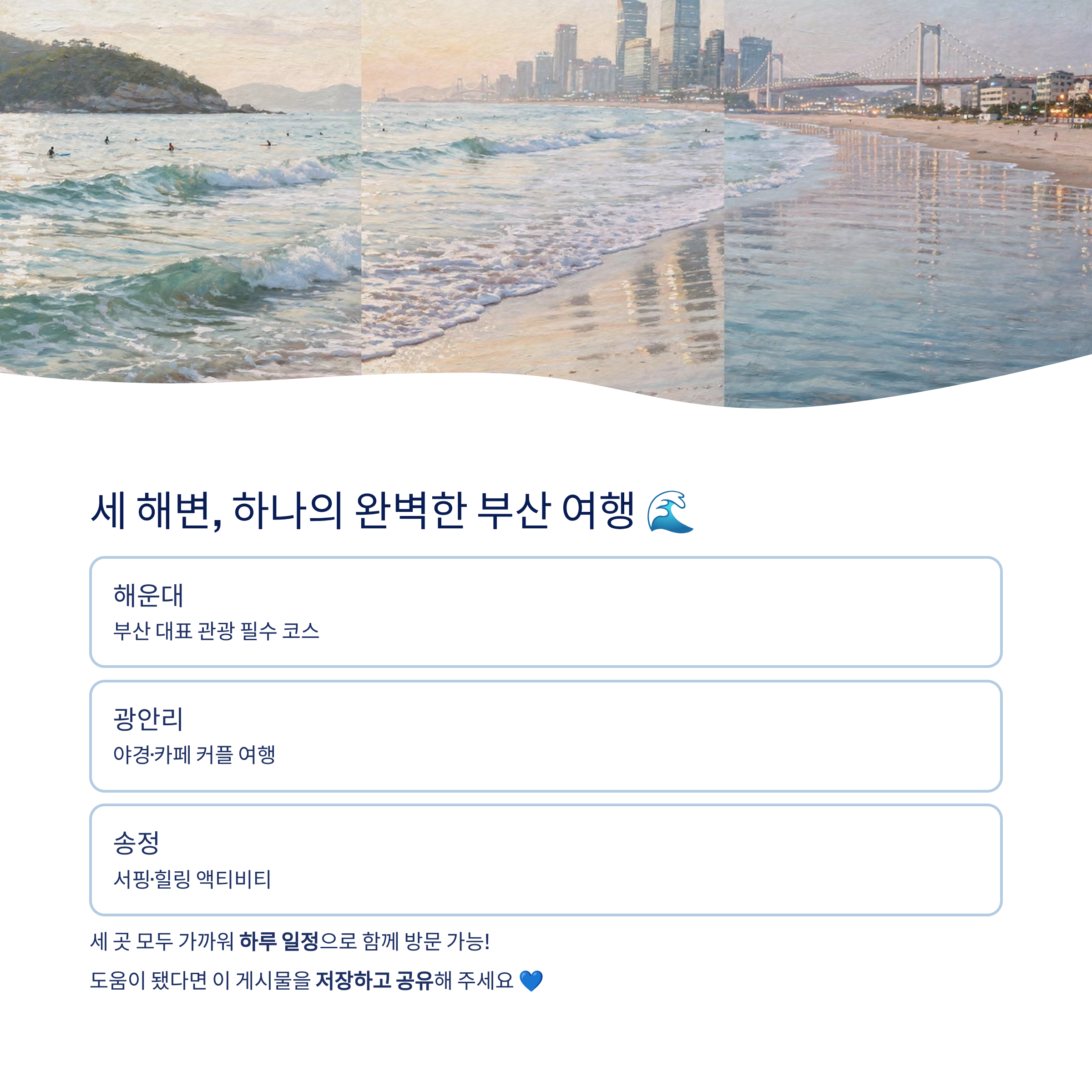 세 곳 모두 아름다운 바다를 볼 수 있지만 분위기, 즐길거리, 여행 스타일이 조금씩 다르기 때문에 여행 목적에 따라 선택하면 더욱 만족스러운 부산 여행을 즐길 수 있습니다. 🌊