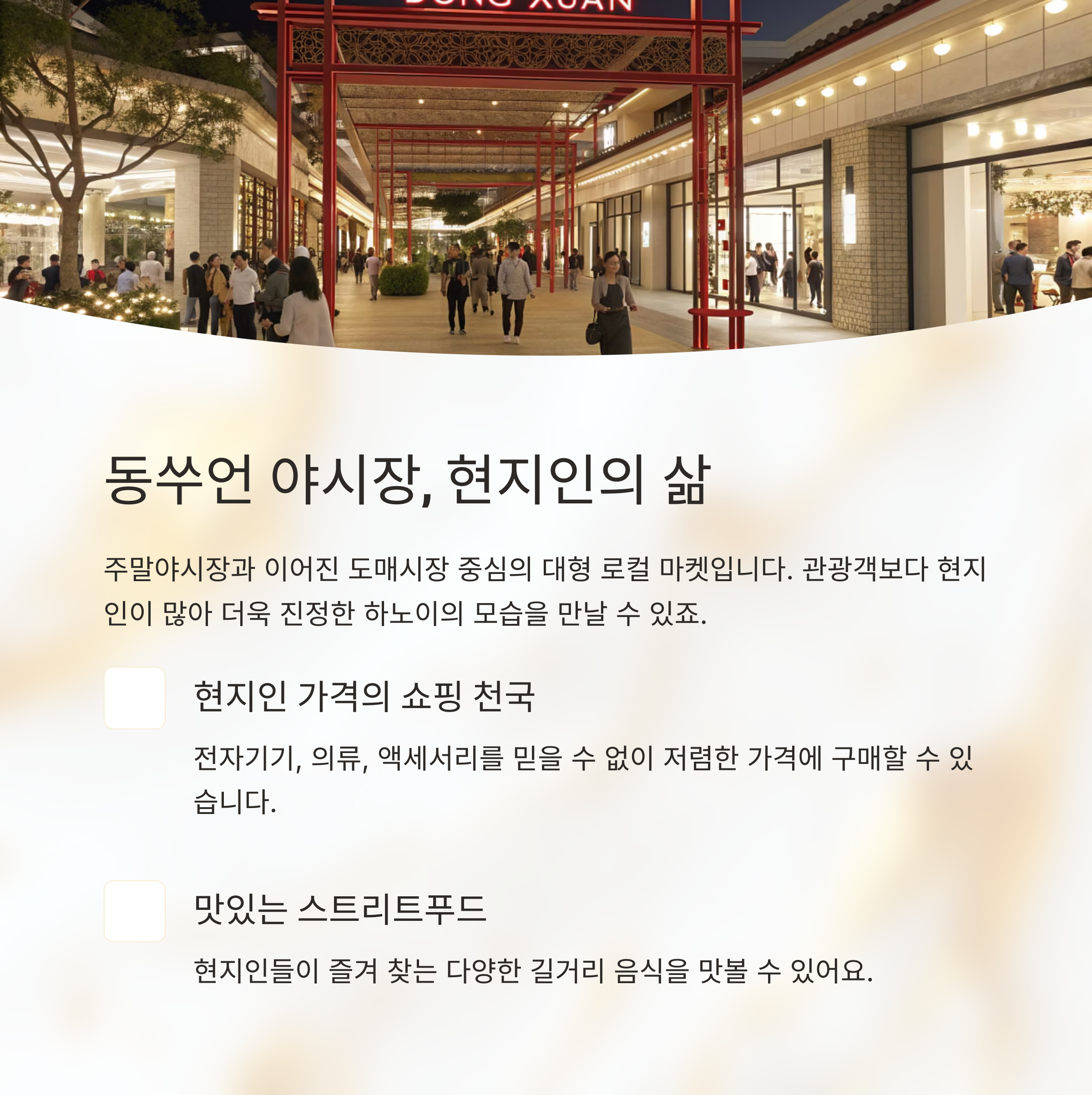 | 동쑤언 야시장 | 도매시장 연결, 로컬 분위기 | 스트리트푸드, 저가 쇼핑 | 주말 저녁 | 붐비는 시장 골목 |
